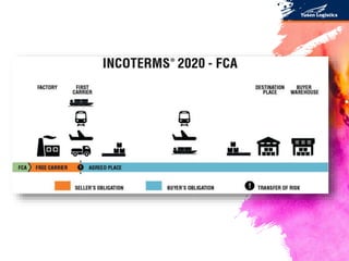 Tài liệu trình bày về Incoterms, bộ quy tắc thương mại quốc tế do ICC phát hành, nhằm hướng dẫn phân chia trách nhiệm giữa người bán và người mua trong giao nhận hàng hóa. Các điều kiện Incoterms 2020 được cập nhật với 11 điều khoản, bao gồm các điều kiện như EXW, FCA, FOB, CIF, và DDP, chi tiết cách thức chuyển giao rủi ro và nghĩa vụ của các bên. Ngoài ra, tài liệu cũng nhấn mạnh các thay đổi về bảo hiểm và quy định bảo mật thông tin trong hợp đồng thương mại.