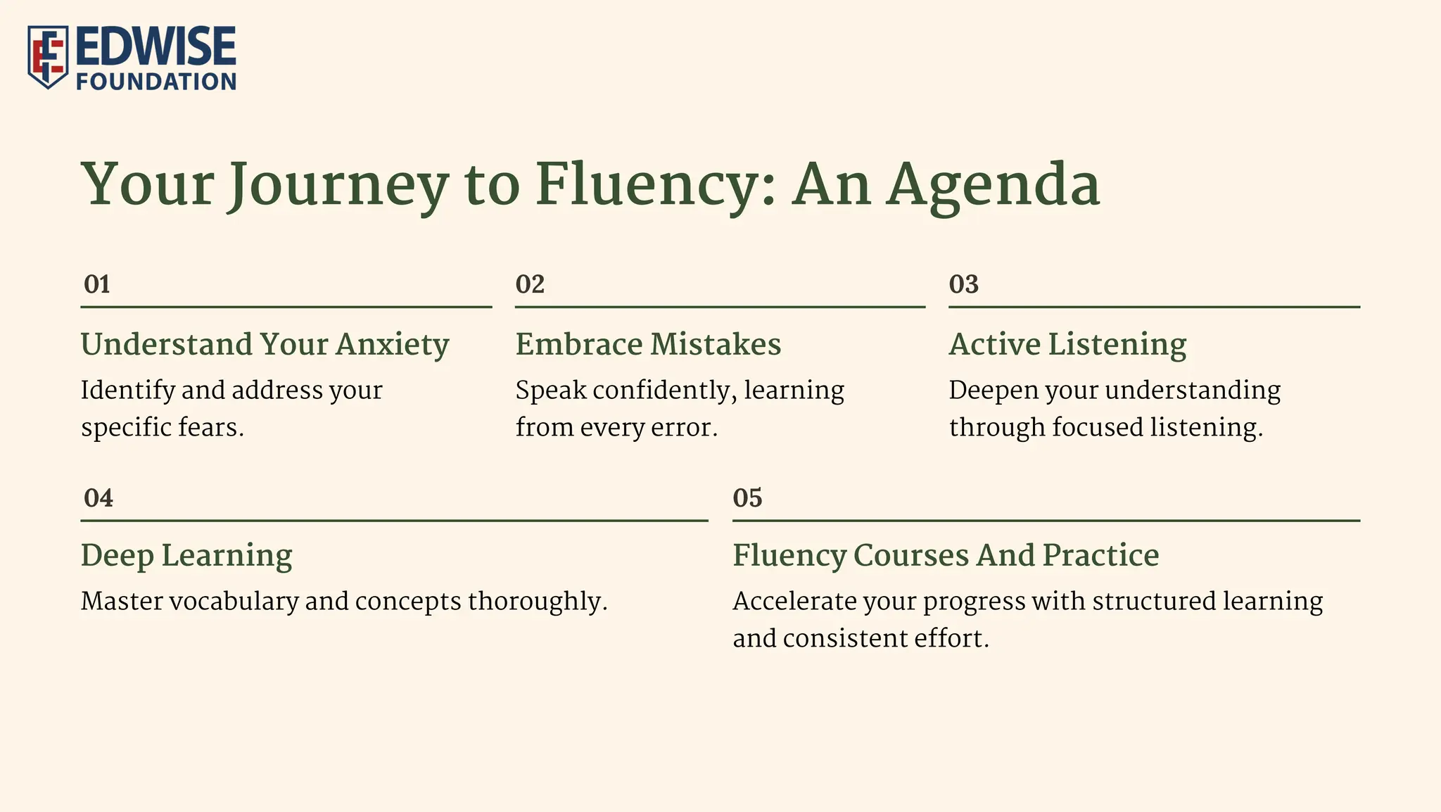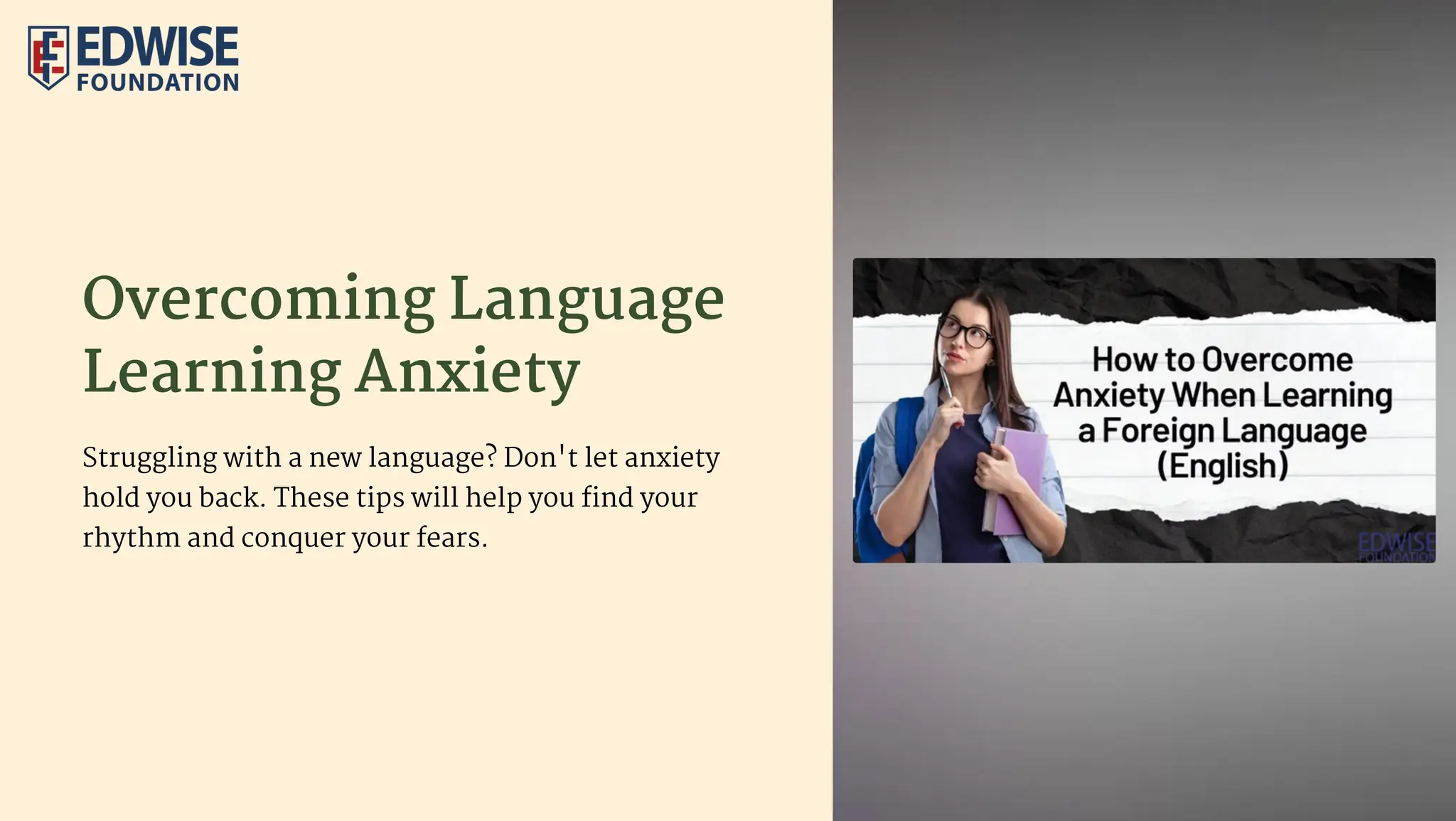 Struggling with language learning anxiety? This PPT provides Nepali students with practical strategies to overcome fear and stress while learning English. It highlights confidence-building techniques, communication skills, and mindset shifts to make language learning easier and more effective. With Edwise Foundation’s expert guidance, students can improve fluency, reduce anxiety, and prepare successfully for study abroad opportunities.