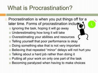 The document provides 10 steps to overcome procrastination: 1) Recognize you have a problem, 2) Figure out why you procrastinate, 3) Get organized with to-do lists and goals, 4) Identify your "frog" or hardest task, 5) Break large tasks into smaller parts, 6) Eliminate distractions, 7) Do not expect perfection, 8) Get support from others, 9) Get started by taking action, and 10) Reward yourself for completing tasks. Following these 10 steps can help you accomplish more and be successful.