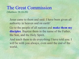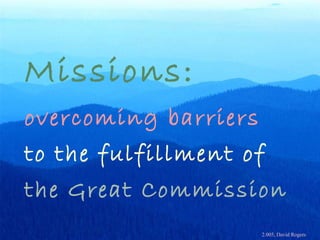 The document outlines 7 barriers that must be overcome to fulfill the Great Commission of making disciples of all nations: 1) the geographic barrier, 2) the language barrier, 3) the cultural barrier, 4) the social barrier, 5) the spiritual barrier, 6) the communication barrier, and 7) the logistic barrier. It provides details on strategies for overcoming each barrier, emphasizing the need to address all barriers through a strategic order and plan of multiplication to effectively reach more people with the gospel.