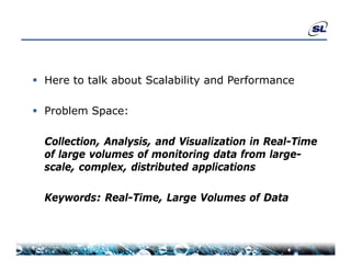 The document discusses the challenges of achieving real-time performance in large-scale data-centric applications, identifying key issues such as database performance, network bandwidth, processor efficiency, and unpredictability due to virtualization. It proposes solutions including proper data modeling, server-side aggregation, and efficient data transfer design patterns to optimize performance. Additionally, the document highlights the importance of understanding data and respecting established design patterns for effective application performance monitoring.