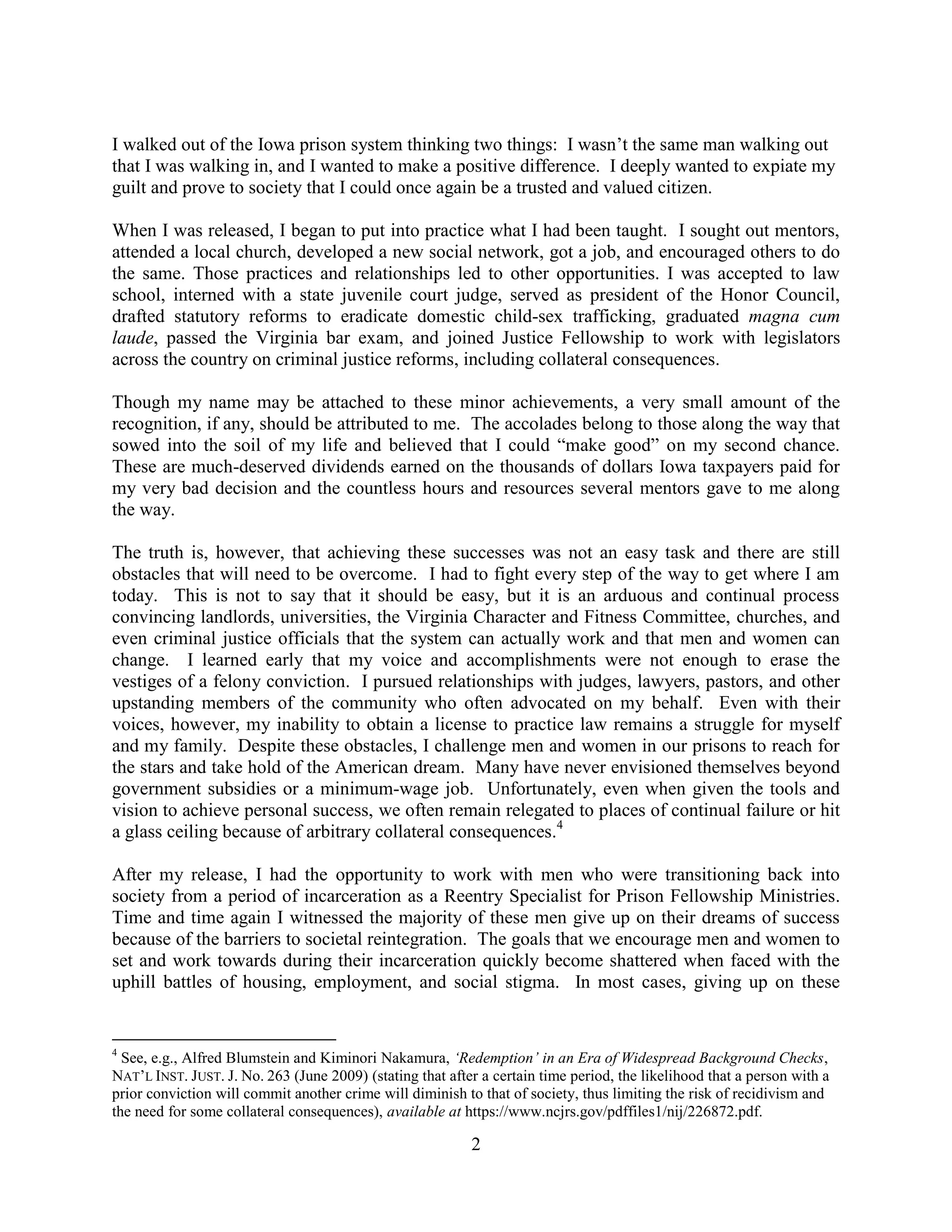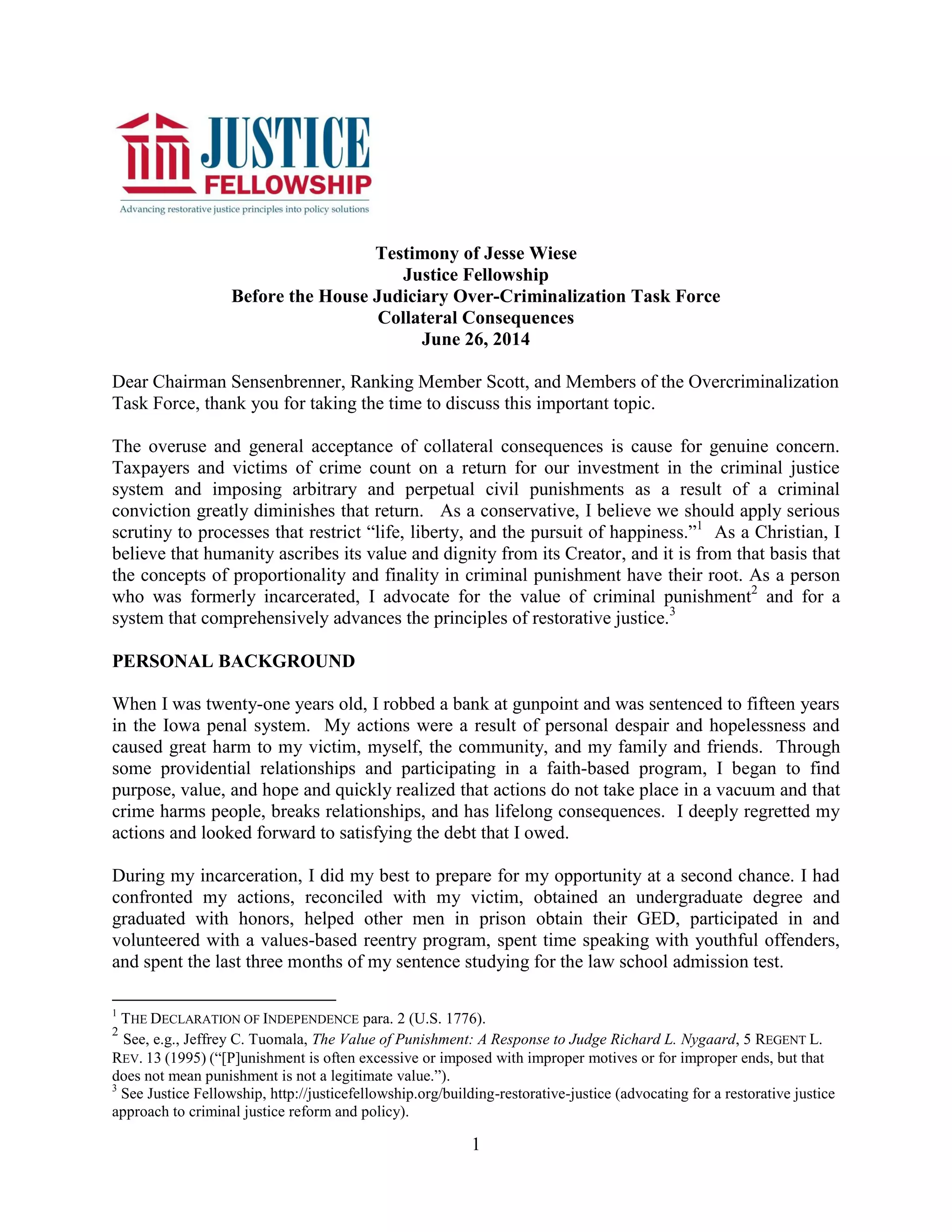 Jesse Wiese testified before the House Judiciary Over-Criminalization Task Force about collateral consequences. He served 15 years in prison for armed robbery when he was 21. After being released, he earned an undergraduate degree, graduated law school magna cum laude, and passed the bar exam. However, he still faces obstacles like being denied a law license due to his past conviction. He argues that collateral consequences prevent successful reintegration and rehabilitation by imposing perpetual civil punishments and restricting opportunities. This wastes taxpayer money spent on rehabilitation programs and discourages people from achieving success after prison.
