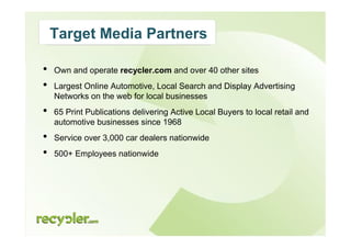 Overdrive is a leading online automotive advertising network that operates over 40 sites and provides services to over 3,000 car dealers in the U.S. The platform directs local buyers to dealerships through multiple channels, including display ads and comprehensive tracking systems showcasing inventory. It emphasizes the importance of online reputation, utilizing customer reviews and strategic positioning across its networks to enhance visibility and generate traffic for dealerships.