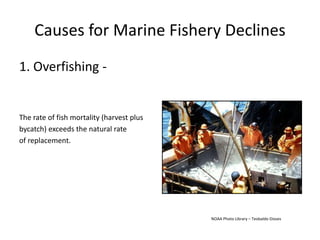 Marine fishery declines are primarily driven by overfishing, use of efficient fishing technologies, bycatch, and overcapacity. Additional factors include global warming and recreational fishing, which impact fish populations and ecosystems. Societal influences such as government subsidies, increasing demand for fish, shifting baselines in fish population perception, and inadequate fisheries data further exacerbate these declines.