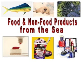 Traditional food production is unable to feed the world's growing population. Marine resources provide food but are under threat. The document discusses major commercial fisheries and species, noting that 500 species are caught commercially by some 200 million people worldwide. It outlines threats like overfishing, bycatch, and habitat degradation threatening fisheries. Sustainable management, aquaculture, and protected areas are proposed as solutions to support marine food sources and livelihoods into the future.