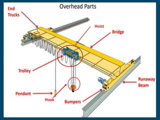 This document provides guidance on overhead crane safety. It outlines requirements for daily operator inspections, including checking the hook, wire rope, control devices and runway systems. Periodic inspections by a qualified person are also required, with frequencies ranging from quarterly to annually depending on crane use. Operational safety procedures are reviewed, such as following signal instructions, maintaining clear views, and not overloading. Recommended forms include a maintenance log, checklists, and training questionnaires. Standard hand signals for crane operations are also presented.