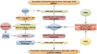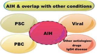 This document discusses overlap syndromes, specifically hepatic overlap syndromes where a patient presents with features of both autoimmune hepatitis (AIH) and primary biliary cirrhosis (PBC) or primary sclerosing cholangitis (PSC). It provides details on the proposed explanations for overlap syndromes, features that distinguish AIH, PBC and PSC, criteria for diagnosing AIH-PBC and AIH-PSC overlap syndromes, treatment recommendations, and practical points regarding implications for prognosis and management depending on the underlying conditions.