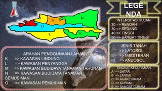This document provides a legend or key for interpreting land use recommendations based on rainfall intensity levels, soil types, slope gradients, and designated land use directions. The legend defines numerical ranges for rainfall and slope measurements, identifies three main soil types, and assigns codes for protected, buffer, agricultural, residential, and other land use areas.