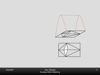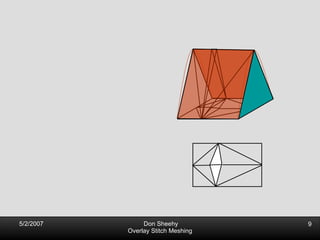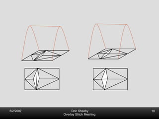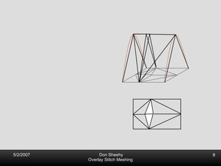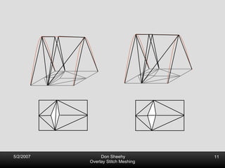 The document describes an algorithm called Overlay Stitch Meshing (OSM) for producing triangulations with no large angles from planar straight line graphs. The algorithm produces triangles with angles between 170 degrees and results in a mesh size that is O(log L/s) competitive with the optimal triangulation, where L is the total edge length and s is the minimum feature size. It works by overlaying triangles and only keeping overlay edges that intersect the input graph in a "good" way, with an angle of at least 30 degrees. The algorithm and its analysis introduce new techniques for proving logarithmic competitiveness.