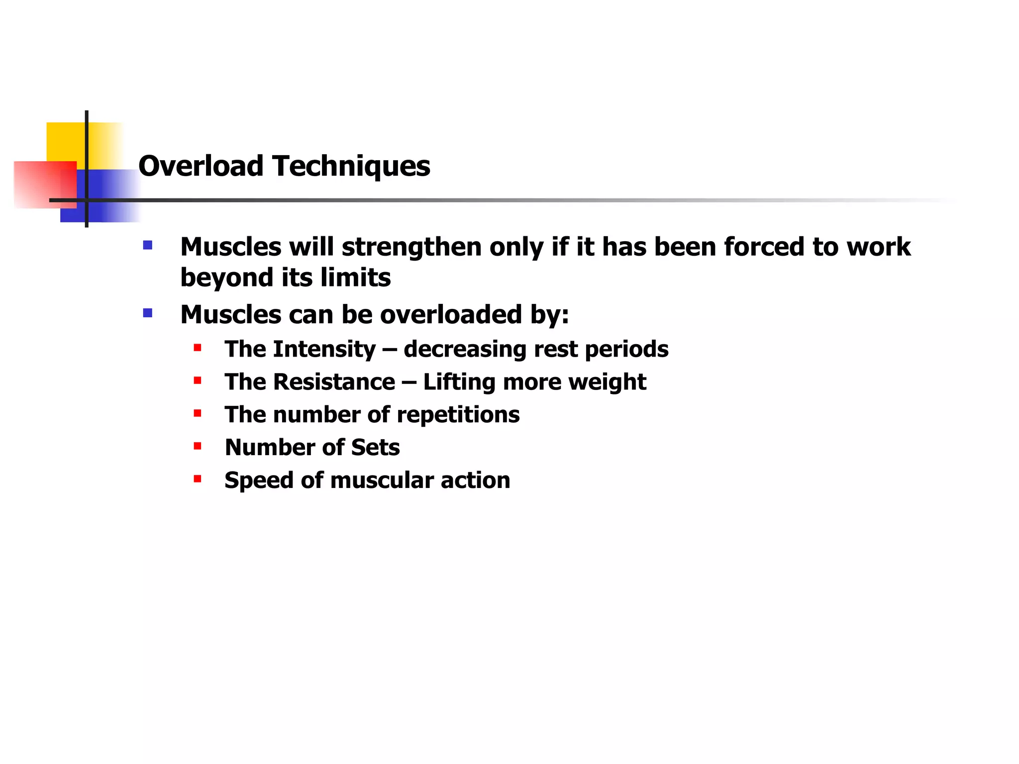 Overload techniques strengthen muscles by forcing them to work beyond their limits. This can be done through increasing intensity, resistance, number of repetitions, or number of sets. Specific overload techniques include blitzing, forced repetitions, pyramid training, compound training, burn out sets, and breathing sets. These techniques use varying weights, reps, sets, and exercises to completely exhaust muscles.