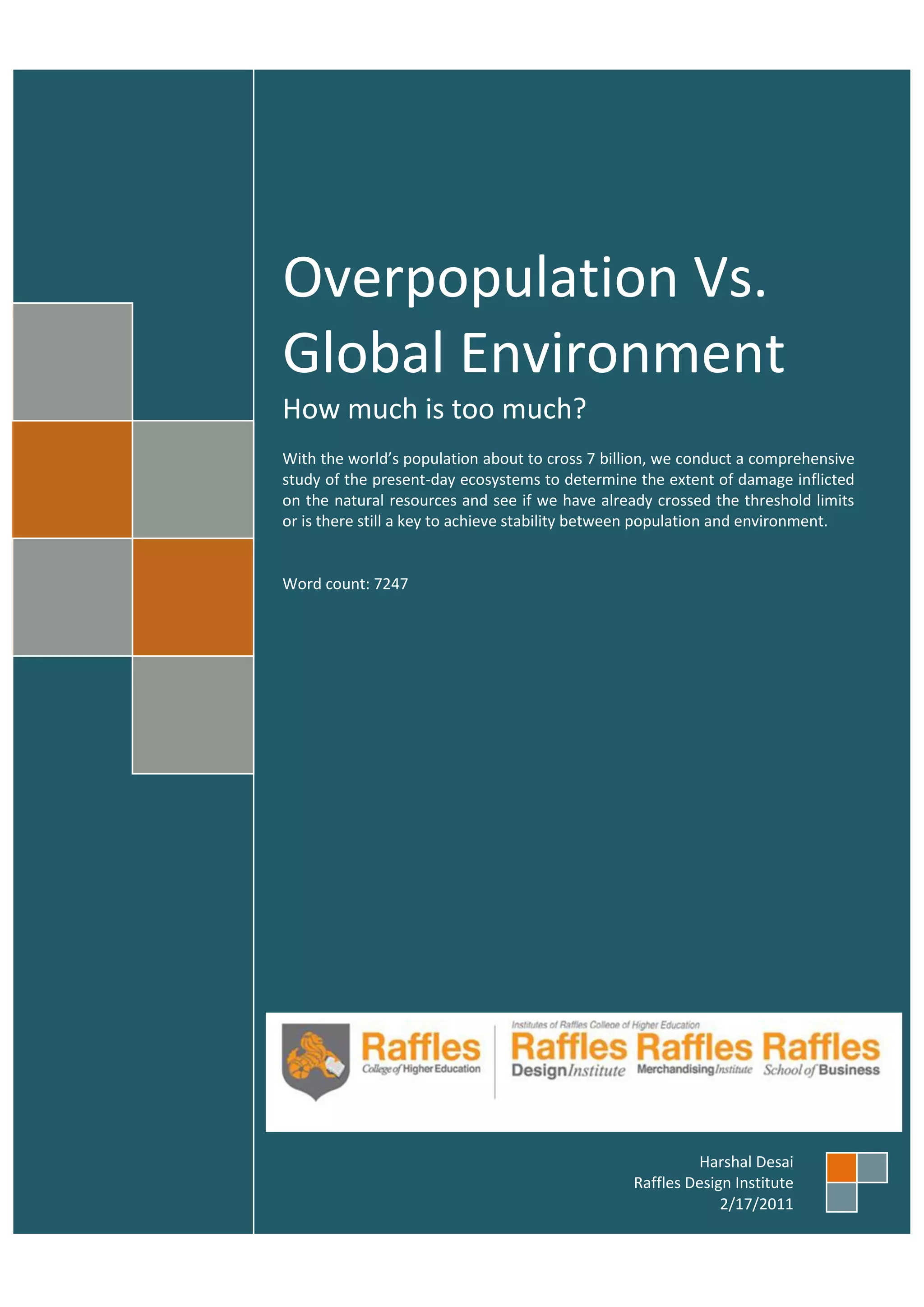 The document presents a comprehensive study on the relationship between overpopulation and the global environment as the world's population approaches 7 billion. It discusses the extensive strain on natural resources, the current state of ecosystems, and the intricate links between population growth, environmental degradation, and resource consumption. Solutions and case studies are suggested to achieve stability between population dynamics and environmental sustainability.
