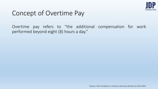 Overtime pay refers to additional compensation for work performed beyond eight hours a day. All employees are entitled to overtime pay except certain government employees, managers, and other exemptions. The overtime rates are 25% of the hourly rate for work beyond eight hours on a regular work day, 30% of the hourly rate for work on rest days or special days, and 30% for work on holidays. Certain employees and employers may stipulate different overtime rates in collective bargaining agreements.