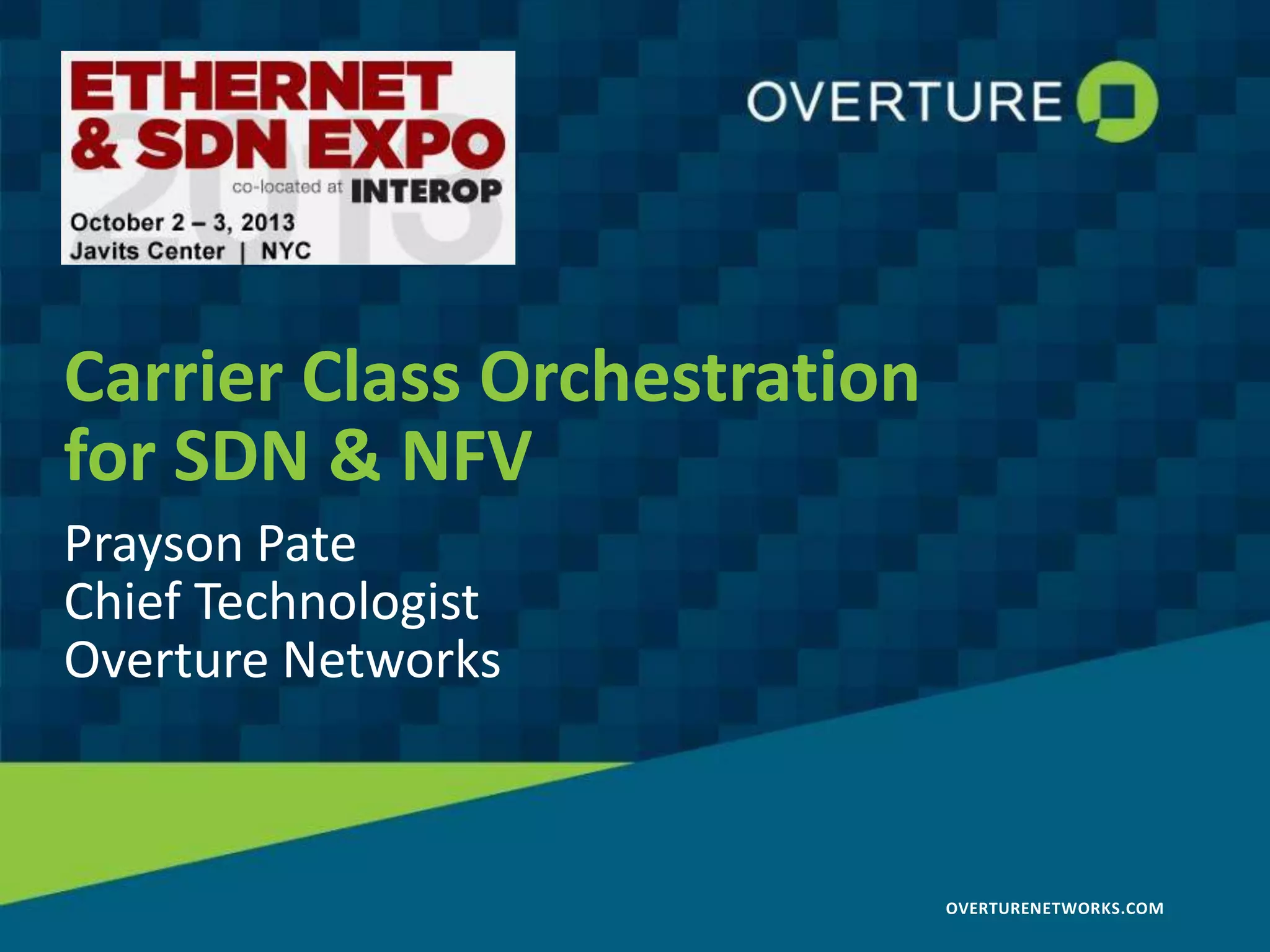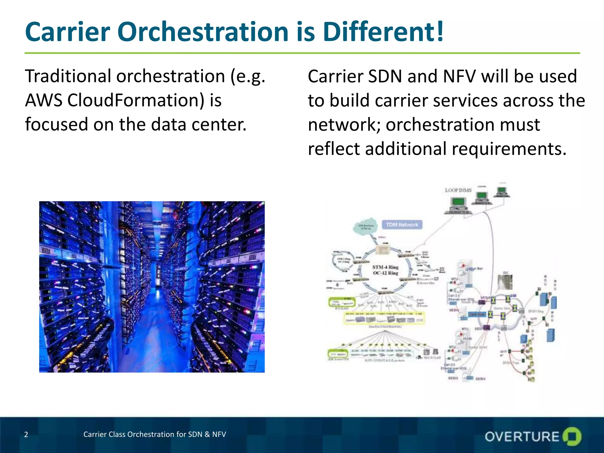 The document discusses carrier-class orchestration for Software-Defined Networking (SDN) and Network Functions Virtualization (NFV), emphasizing the unique requirements for building carrier services across networks compared to traditional data center orchestration. It highlights key concepts such as resource location significance, service elasticity, orchestrator scalability, and multi-tenancy in orchestration design. The summary outlines how these factors influence resource management and system integration for improved service reliability and performance.