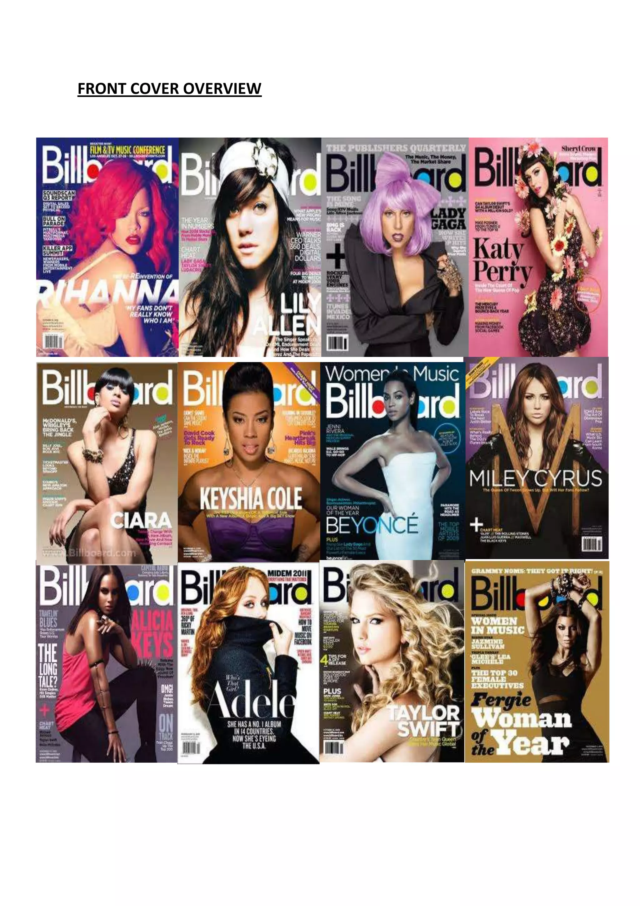 The document provides an overview of the front covers of 12 issues of the Billboard magazine in order to analyze the codes and conventions they use to address their target audience. Most front covers feature a solo female artist as the main image with the magazine's masthead in a consistent font and placement. Sell lines focus on the artists' music and success rather than gossip. All covers have a plain background and consistent layout that maintains the magazine's brand identity across issues.