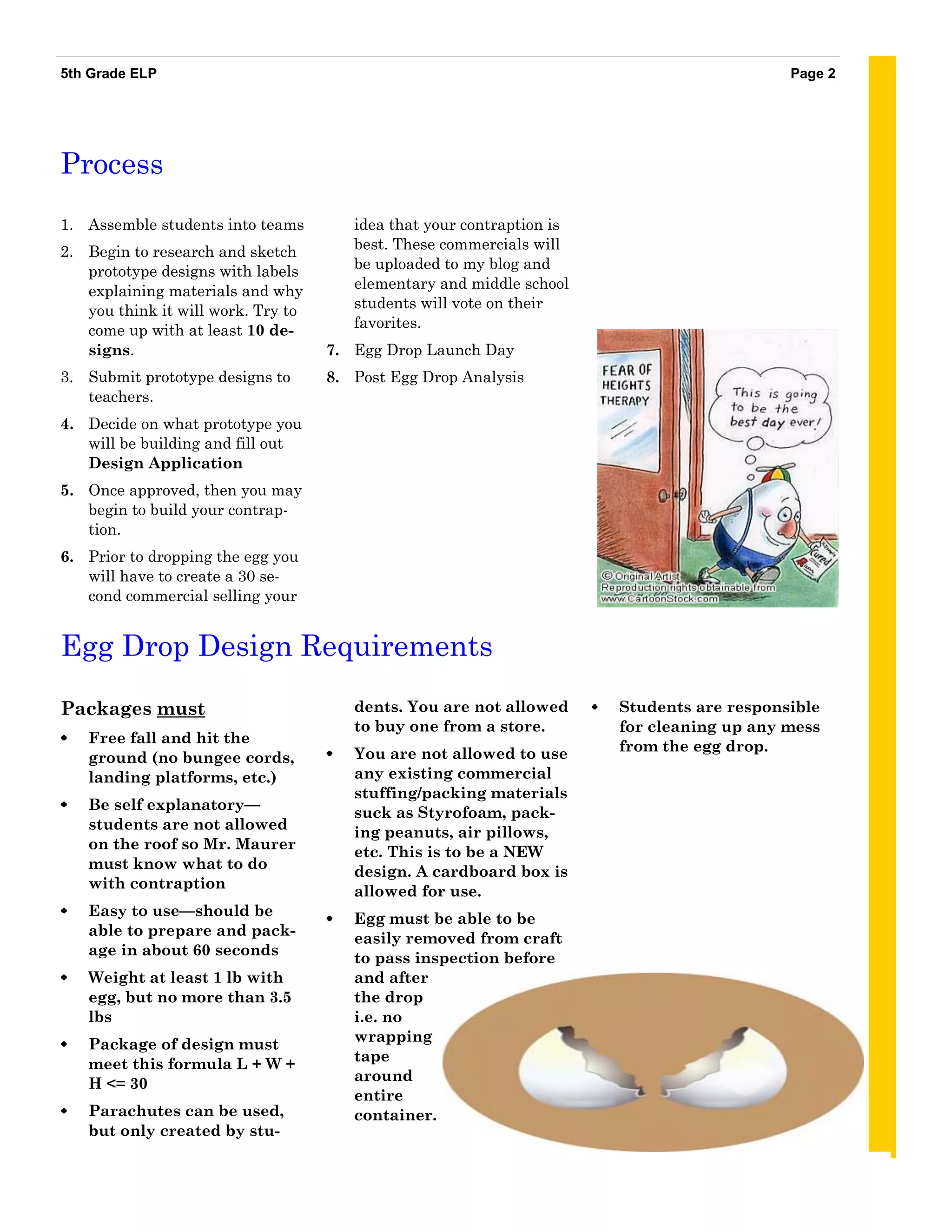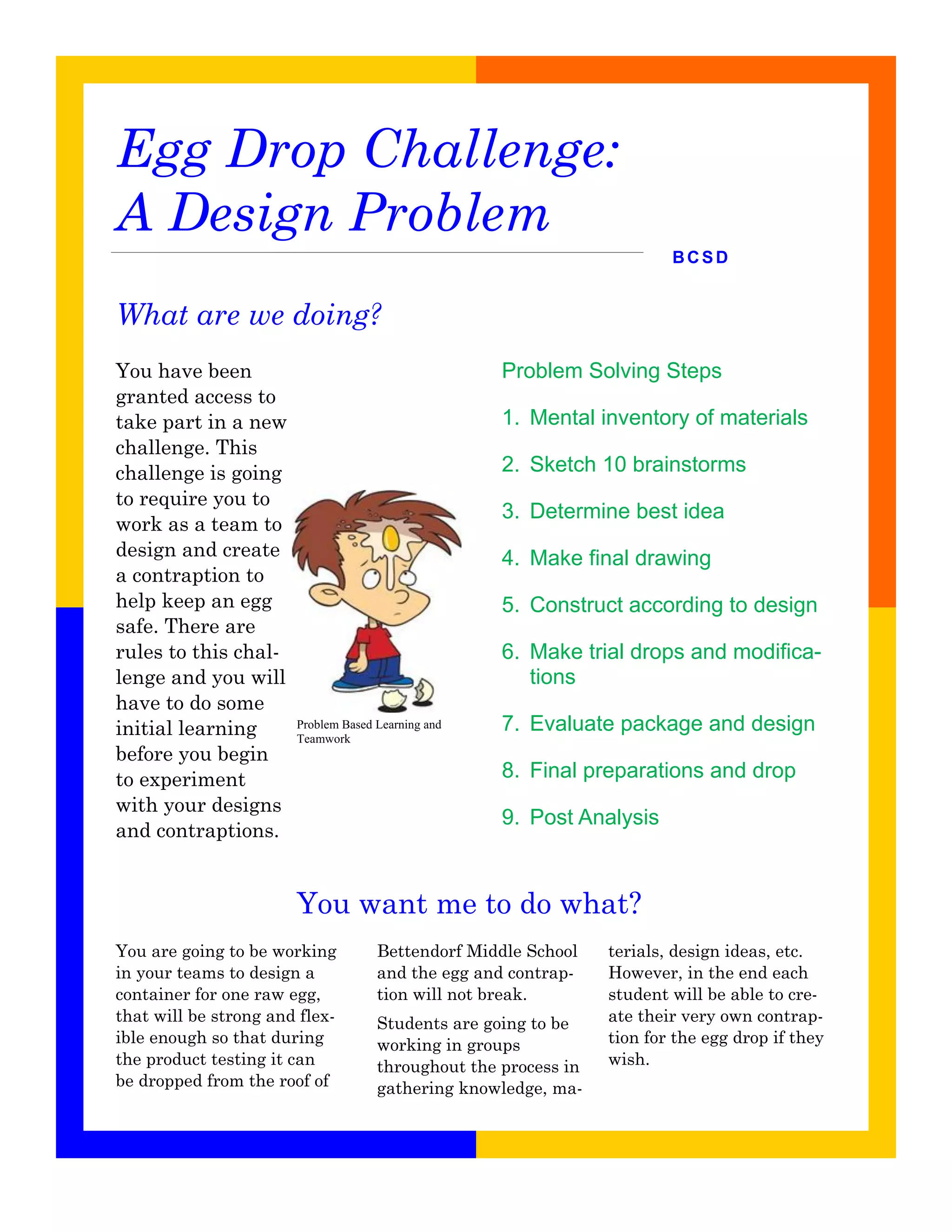 This document outlines an egg drop challenge where students work in teams to design and build a container to safely carry a raw egg from a roof. It provides the challenge details, design requirements, evaluation criteria, and timeline. Students will go through a problem-solving process of brainstorming, prototyping, building, and testing their designs. Their containers will be launched from a roof and graded based on a scoring system accounting for the container's weight and how long it takes to impact the ground without breaking the egg. Awards will be given for various categories like lightest or smallest successful design.