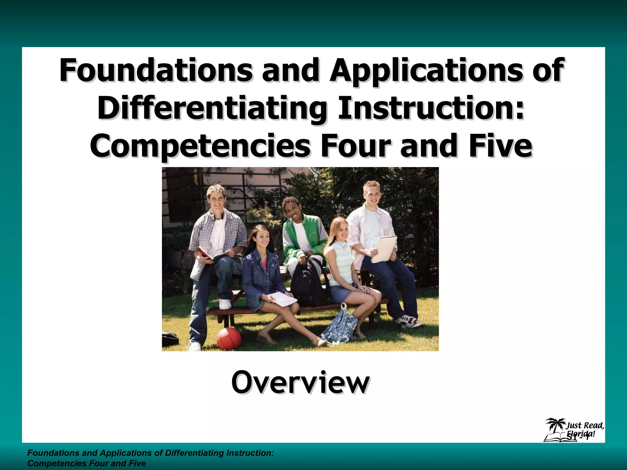 The document discusses differentiating instruction to meet the needs of diverse students. It defines differentiated instruction as a systematic approach that considers how students differ in their backgrounds, readiness, interests and learning styles. The document outlines Florida's reading endorsement competencies regarding differentiated instruction and providing support for struggling readers. It also discusses assessing students, grouping students flexibly, scaffolding instruction, and creating lessons that engage and challenge students at their ability levels.