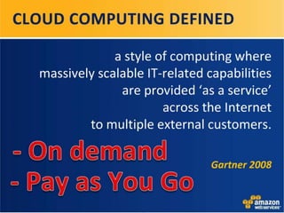 Amazon Web Services (AWS) is a cloud computing platform that provides scalable computing resources and services to customers worldwide. [AWS utilizes Amazon's expertise from running their global e-commerce business to offer a variety of computing services including compute, storage, databases, analytics, and more through an on-demand delivery model.] AWS operates in multiple regions and availability zones to provide high availability and reliability for applications. Customers pay only for what they use with no upfront infrastructure costs.
