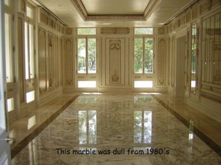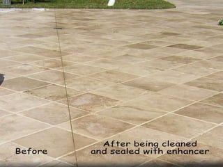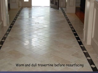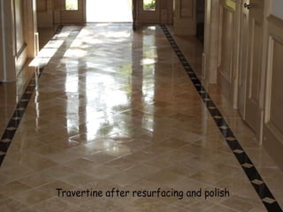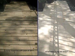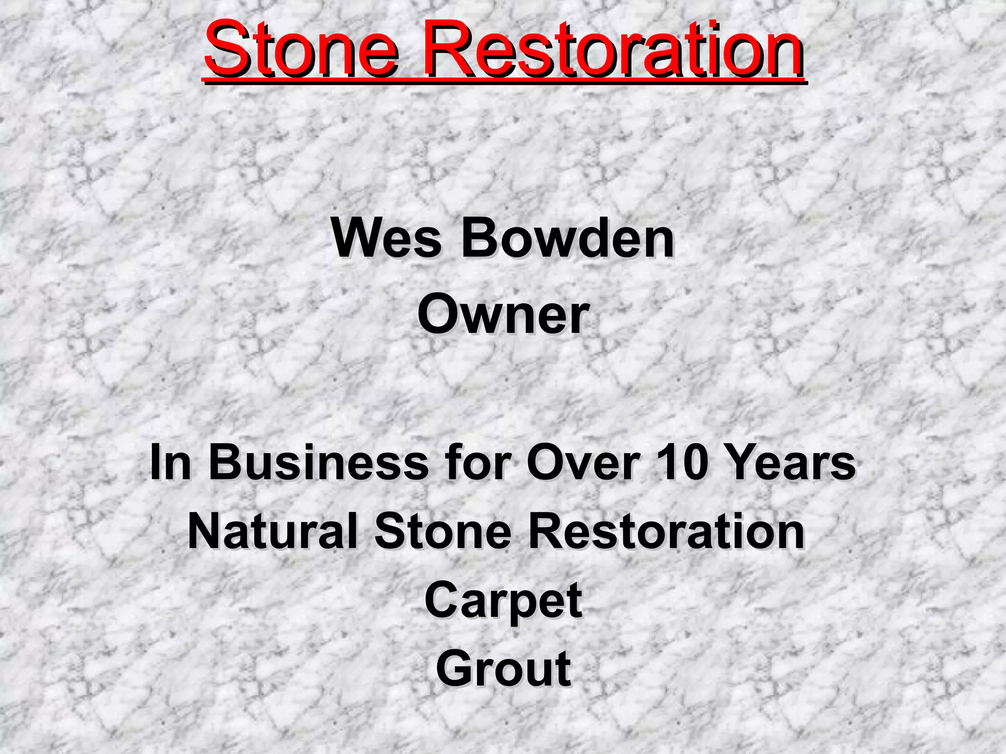 Stone Restoration Wes Bowden Owner In Business for Over 10 Years Natural Stone Restoration Carpet Grout. The document summarizes the services provided by Stone Restoration Wes Bowden for restoring various types of natural stone including travertine, marble, granite, and slate. It compares the costs and disruptions of replacing stone versus restoring it, noting that restoring is more cost effective and less disruptive as it can be done in 1-3 days without ripping up existing stone and creating dust throughout the home.
