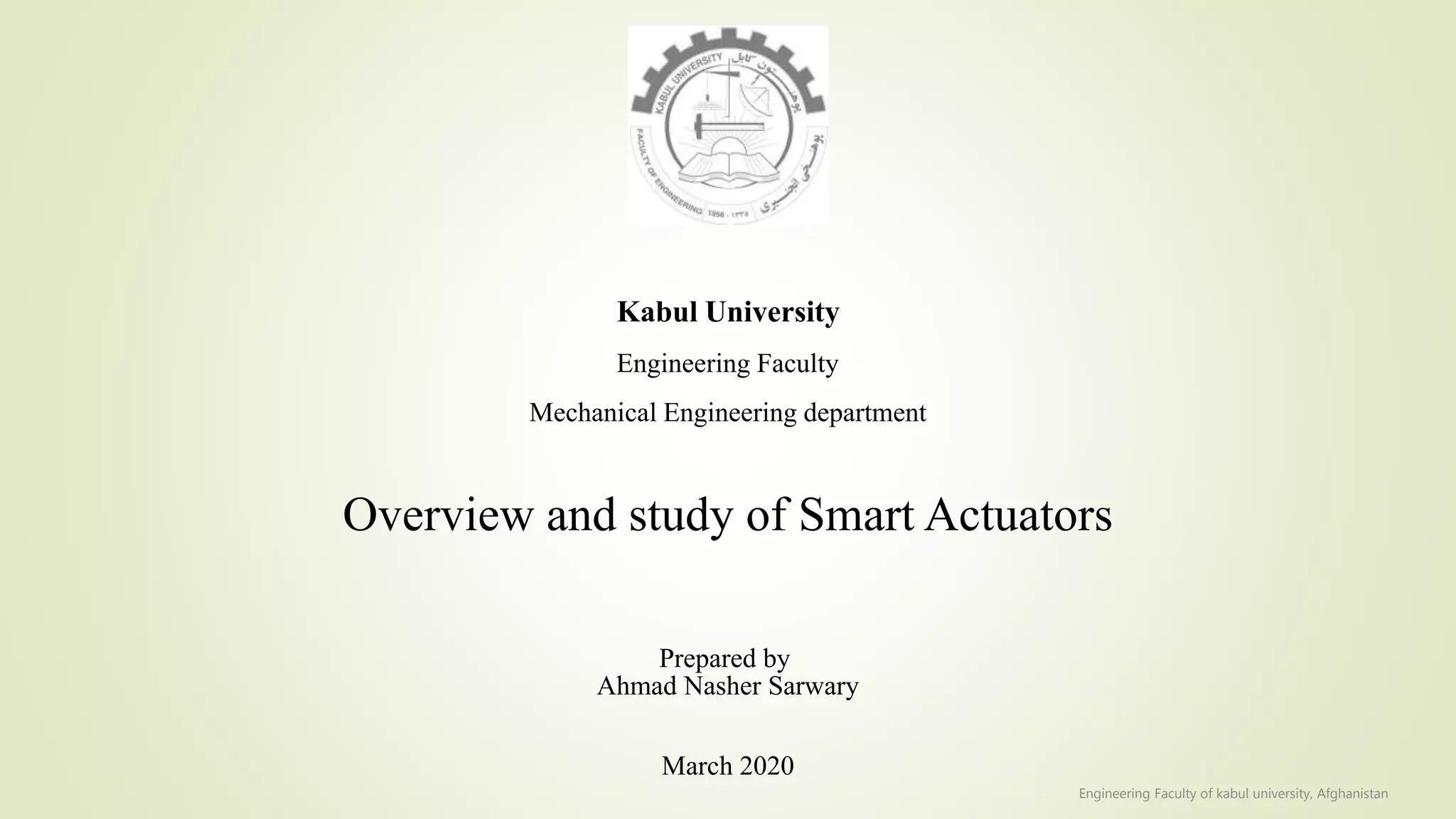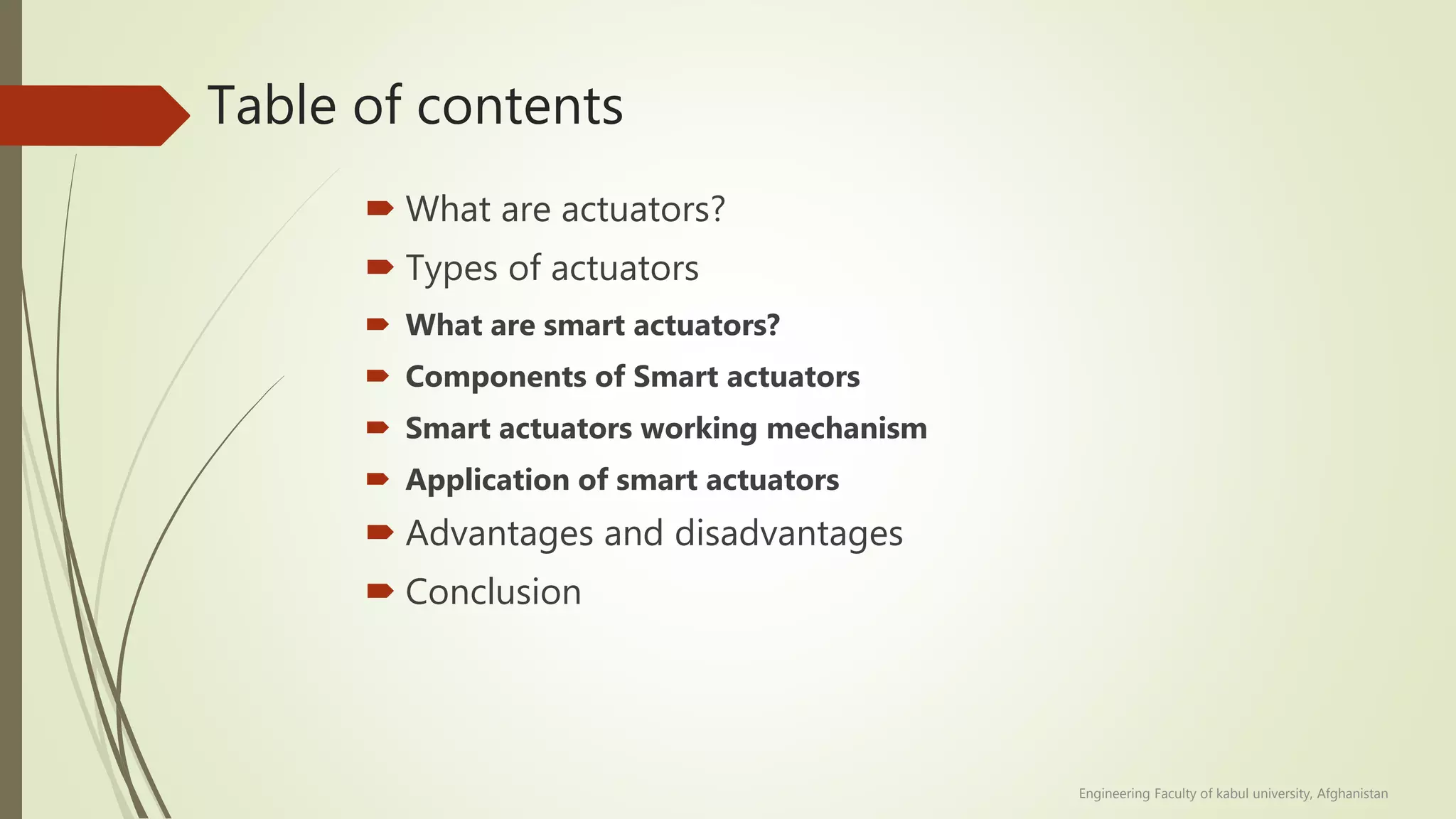 The document discusses smart actuators, which are devices that convert input energy to motion and automatically react to variable changes in their environment. It covers their components, working mechanisms, applications, and the advantages and disadvantages of using smart actuators in various fields like healthcare, automation, and robotics. The conclusion emphasizes their significance in enhancing efficiency and improving quality of life, while highlighting the need for further research.