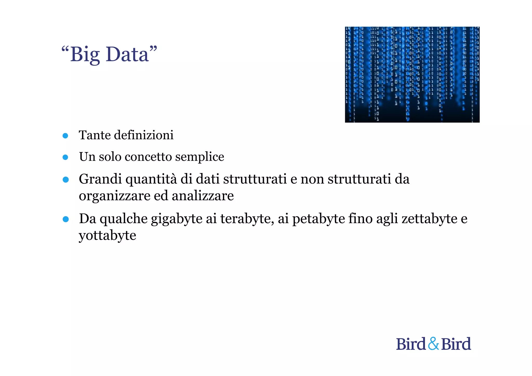 Il documento esplora il concetto di 'big data', descrivendone le caratteristiche principali, come volume, velocità e varietà, e la crescente importanza nella gestione e analisi dei dati sia strutturati che non. Vengono presentati esempi significativi di applicazione dei big data, come la Sloan Digital Sky Survey e l'analisi dei dati nel settore assicurativo e della logistica. Infine, si trattano le problematiche legali collegati all'uso dei big data, come diritti di proprietà, privacy e sicurezza.