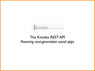 The document discusses the Knodes REST API designed for next-generation social applications, emphasizing its features such as unified social sign-on, normalized views of people, and relationship mapping. It highlights the importance of data management across various networks and includes functionalities like unstructured data search and user similarity scoring. The quote from Neo underscores the API's potential to initiate new developments in social networking.
