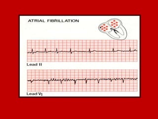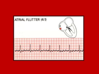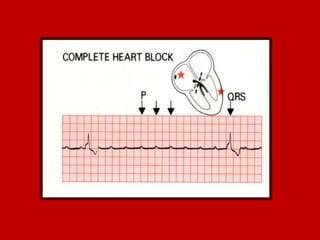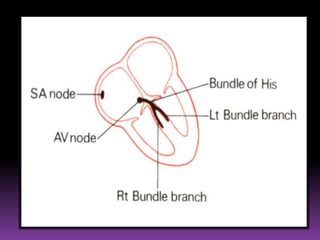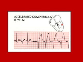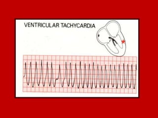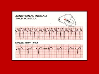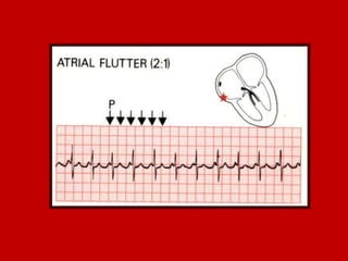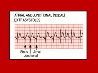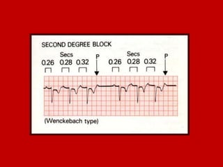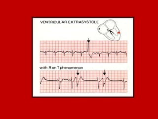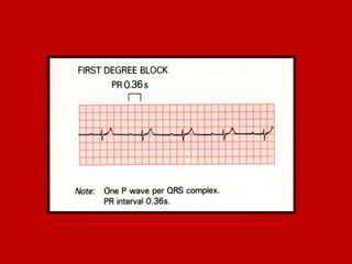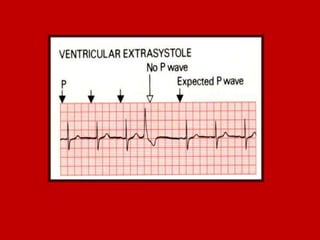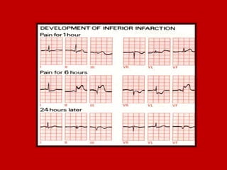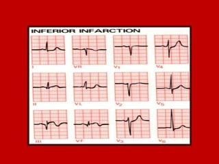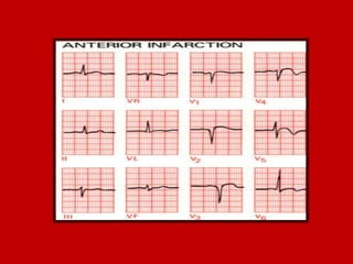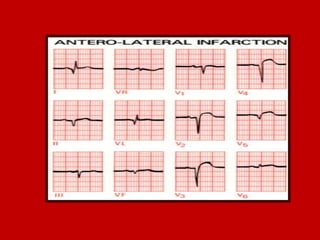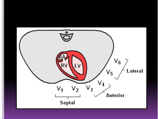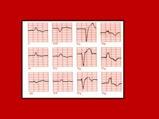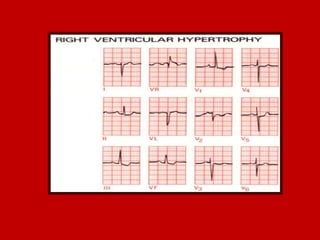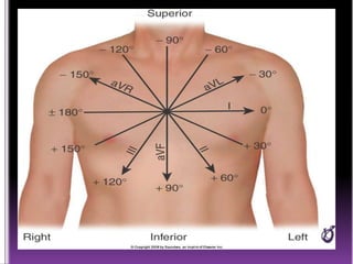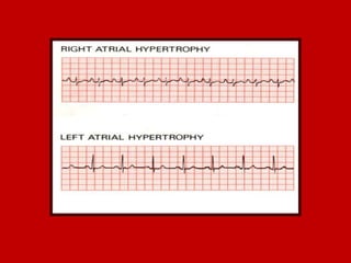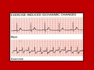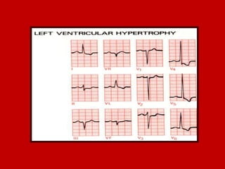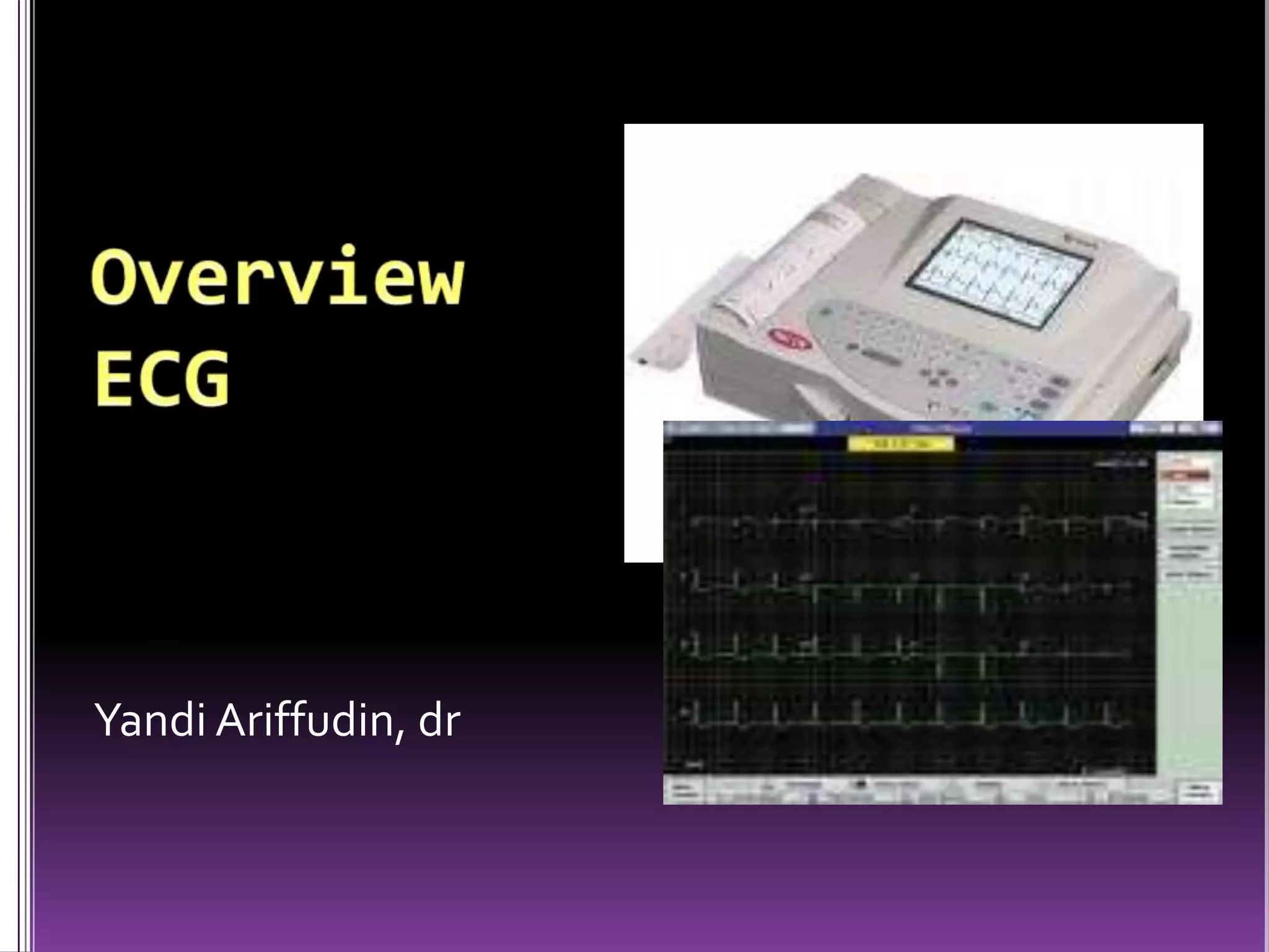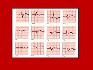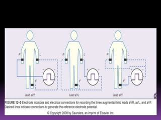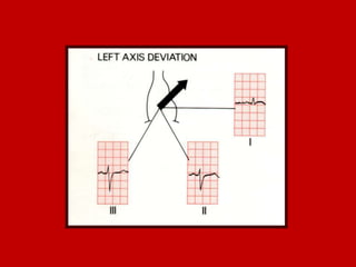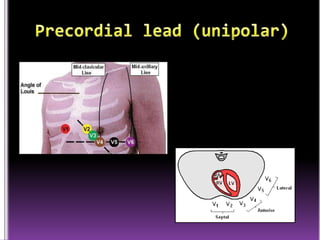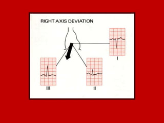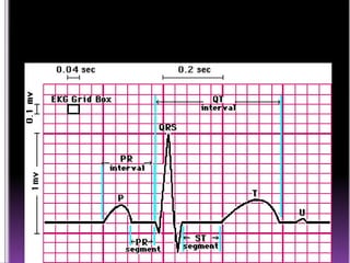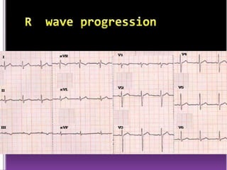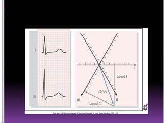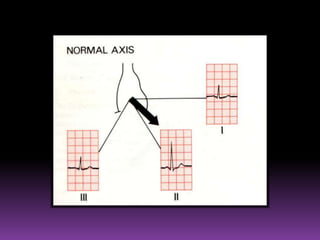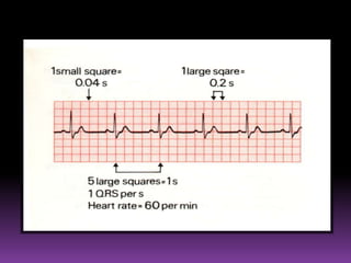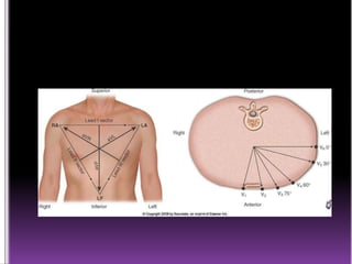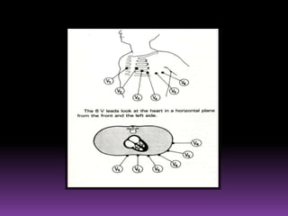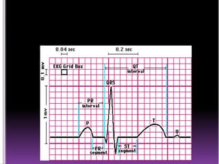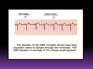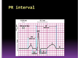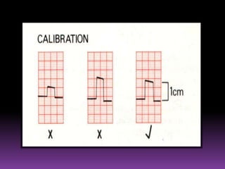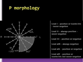 This document contains information about electrocardiography (ECG) including how to interpret various components of the ECG like the P wave, QRS complex, T wave, and intervals. It discusses how to measure heart rate, determine the cardiac axis, identify abnormalities, and report key findings. The document provides details on the normal morphology and measurements of the various waves and intervals that make up the ECG.