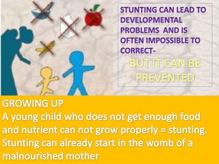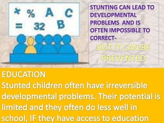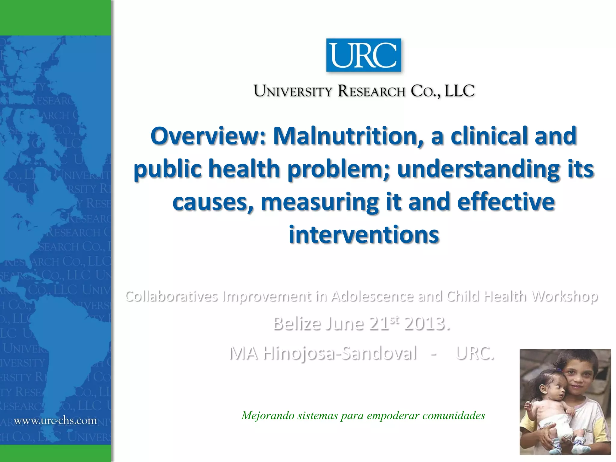 This document discusses malnutrition in Belize and evidence-based interventions. It provides statistics showing that 22% of children in Belize are stunted. The first 1000 days of life are critical for development and damage from malnutrition during this period is largely irreversible. Recommendations to tackle chronic malnutrition in children under two include preventive and early interventions, community empowerment, improving quality of health services, and ensuring sustainability through quality improvement. The Belize health system considers these strategies to address the country's chronic malnutrition problem.