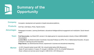 The document discusses the development of playful educational platforms aimed at improving student engagement and learning experiences in Brazil, highlighting the importance of innovative pedagogy and gamification. It details the launch and evolution of the OJE platform, its impact on educational practices, and the challenges in current learning environments. The text also underscores the significance of collaborations and market potential in shaping the future of education through technology.