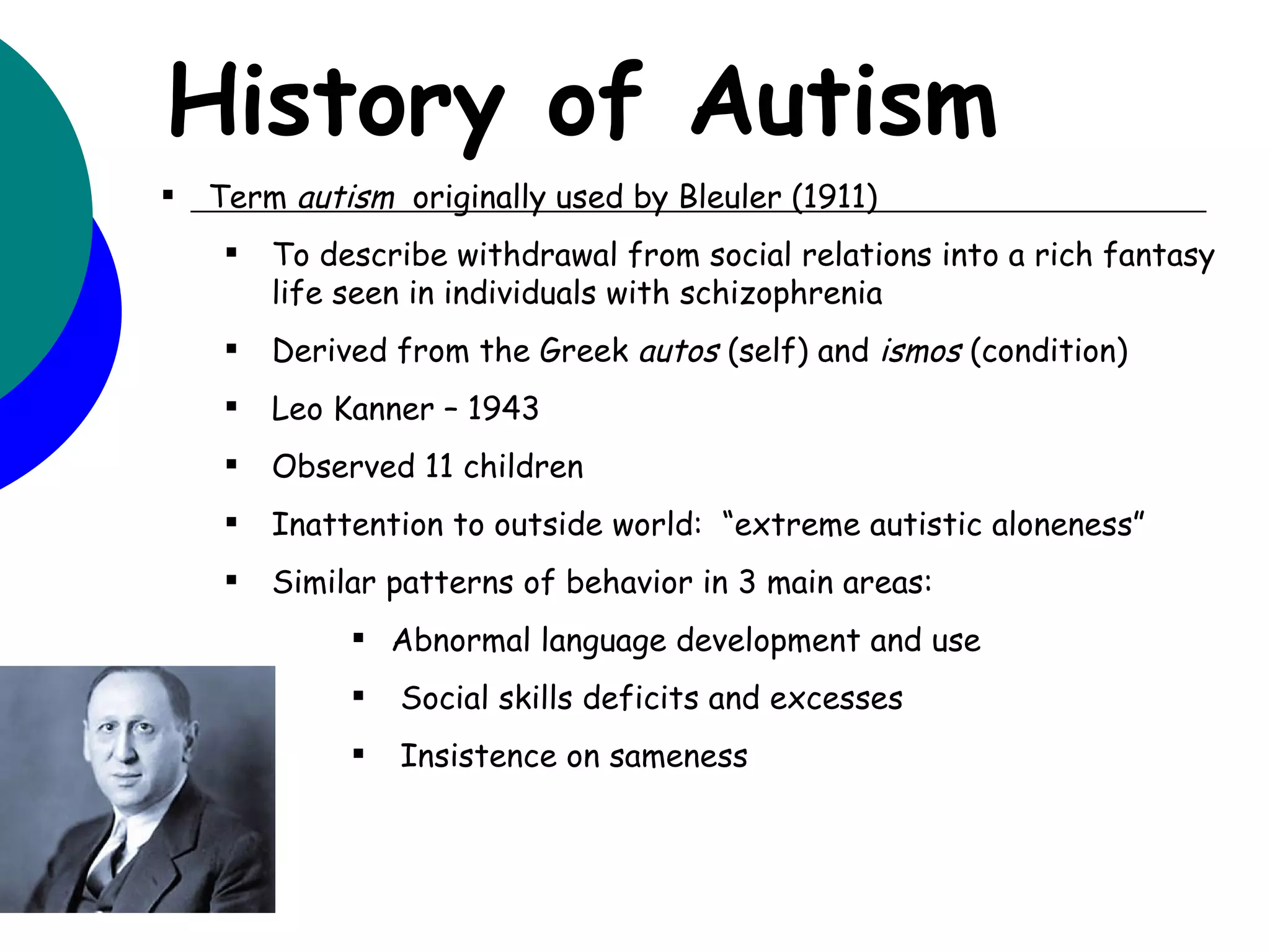 The document provides a history of autism including its original use by Bleuler in 1911 and further definition by Kanner in 1943. It discusses research and definitions by Asperger, Eisenberg, Creak, and Rutter that helped characterize autism. The Diagnostic and Statistical Manual of Mental Disorders (DSM) included autism for the first time in 1980 and further defined pervasive developmental disorders. The DSM-IV criteria require impairments in social interaction, communication, and repetitive behaviors. Prevalence of autism has increased since first measured in 1966, estimated now at 1 in 150 children. Boys are 4 times more likely to be affected than girls.
