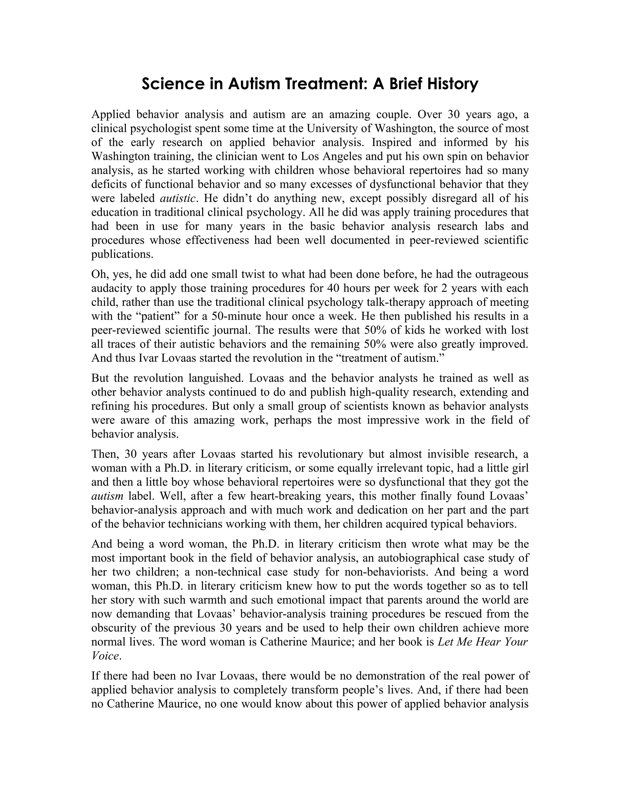 The document provides a history and overview of the Basic Practicum program at Western Michigan University for students to work with children with autism at WoodsEdge Learning Center. It describes how the program began in the 1970s providing services to students with disabilities based on applied behavior analysis. Over time, as research showed effectiveness of early intensive behavioral intervention for autism, WoodsEdge developed a discrete trial classroom in 1995 for children with autism. The practicum continues today, allowing WMU students to gain hands-on experience implementing ABA techniques with children under supervision. Students complete training and work with an assigned child for 2 hours daily, using 15-minute sessions to teach skills through discrete trial instruction.