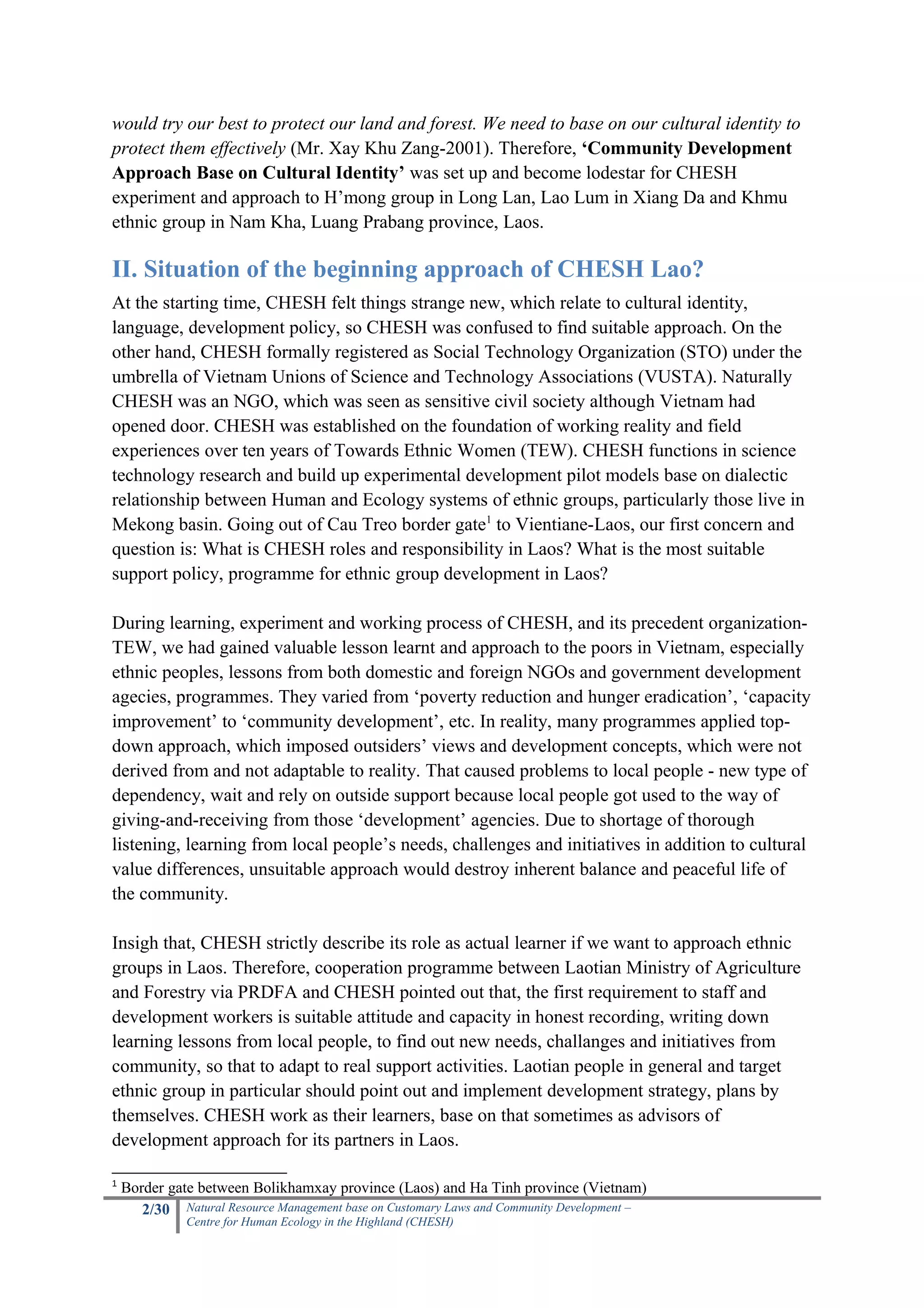 The document discusses lessons learned from CHESH Lao's community development approach based on the cultural identities of ethnic groups in Laos. It summarizes CHESH Lao's initial confusion in setting an approach, and the valuable advice received from local leaders. This advice emphasized the importance of developing a sustainable approach by learning from communities and basing the strategy on their cultural identities. It also highlights key findings about the cultural identities of the Hmong in Long Lan village, Lao Lums in Xiang Da village, and the Khmu in Nam Kha village, including the Hmong's "No Song" customary laws and ceremonies.