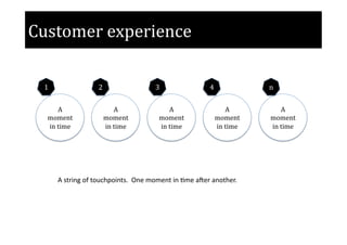 The document discusses customer touchpoint mapping to better understand a customer's experience. It describes touchpoints as moments in time that make up a customer's overall experience. Each touchpoint can be analyzed in terms of what the customer values, what could improve the experience, and what could make it worse. Mapping touchpoints helps organizations understand how to enhance customer experience through more "pluses" and fewer "minuses" at each moment. A thorough mapping process involves sketching out, filling in details of, and finalizing a learning map of all touchpoints to then educate employees on improving customer service.