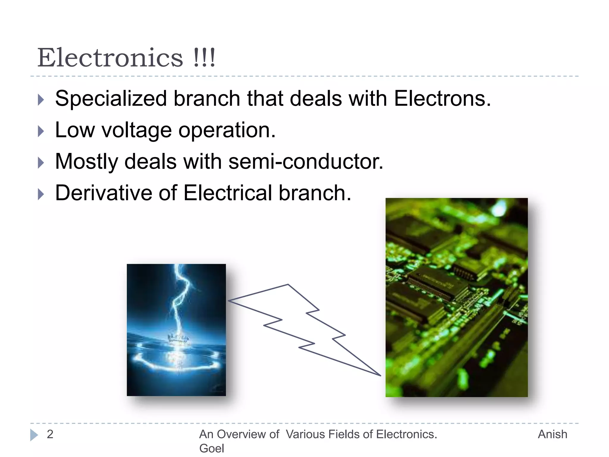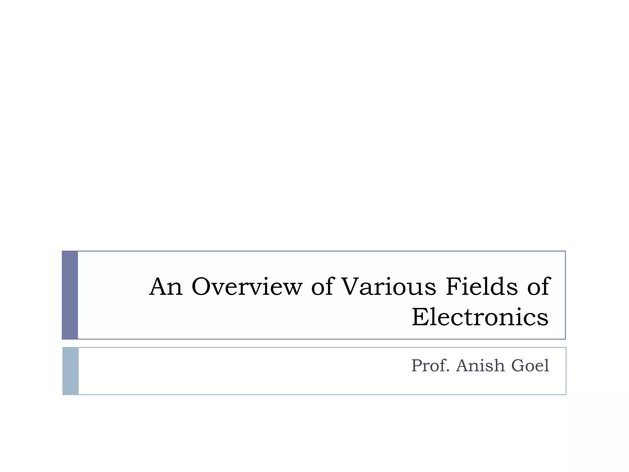 The document provides an overview of various fields in electronics, including embedded systems, semiconductor devices and microelectronics, digital electronics, microprocessors and computer architecture, digital signal processing and communication, computer networks, and power electronics and control systems. It discusses topics such as embedded system design, transistors and circuit elements, digital logic, microprocessor functionality, analog to digital conversion, computer networking, and control system modeling. Examples are given for each field to illustrate concepts and applications.