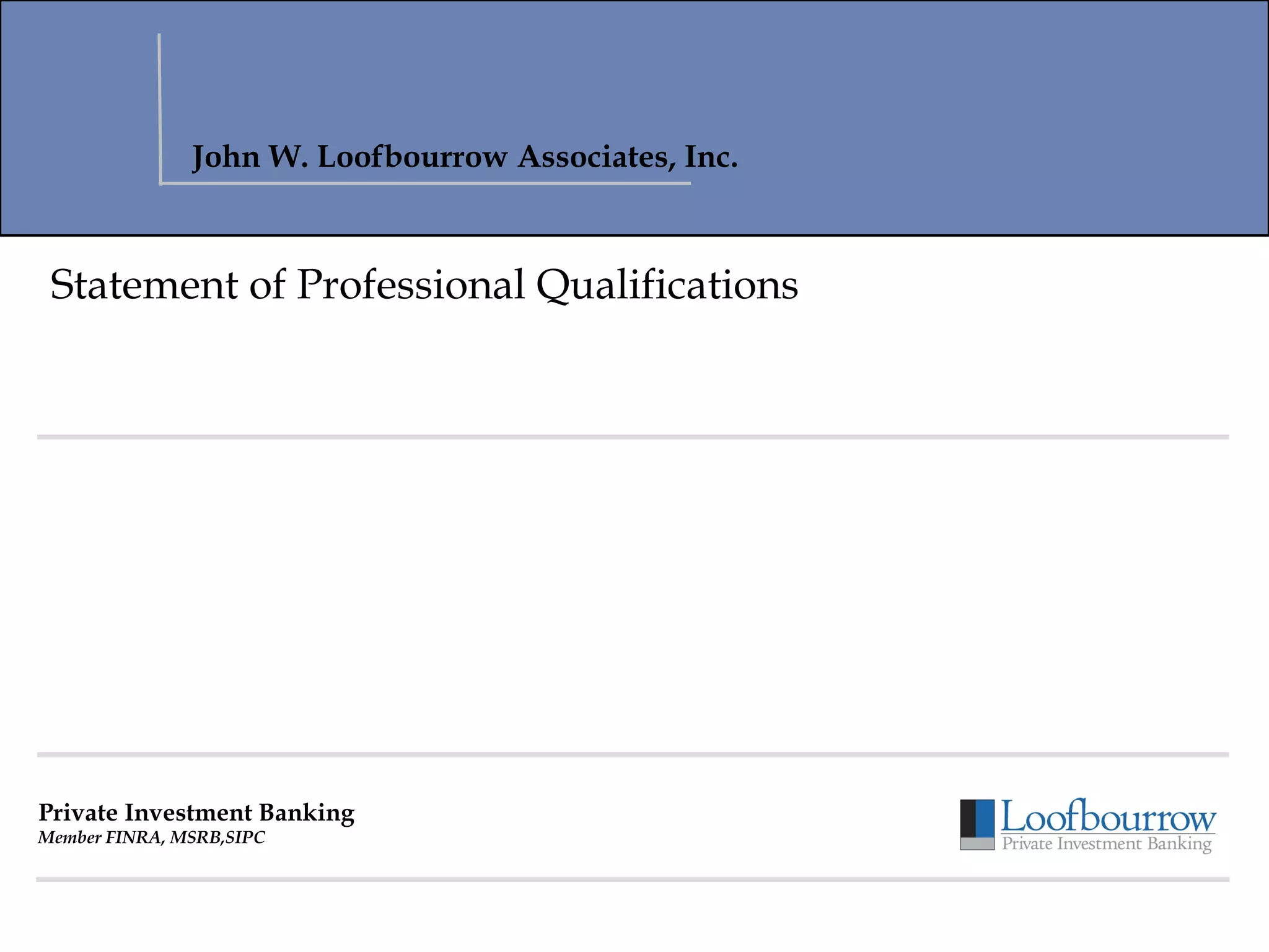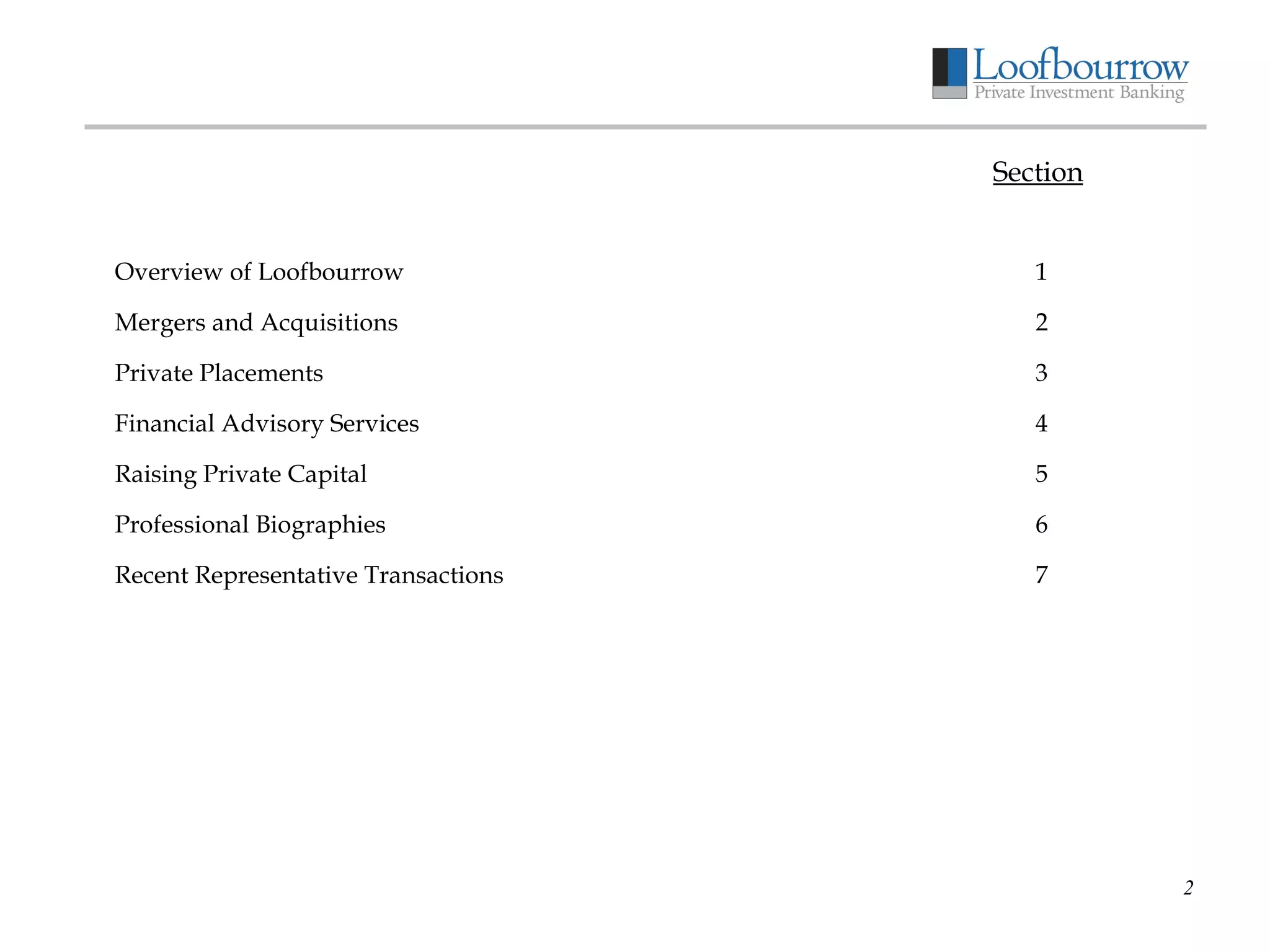 Loofbourrow Associates is a private investment banking firm that provides corporate finance services including mergers and acquisitions, private placements of debt and equity, and financial advisory services. It focuses on middle-market companies and transactions ranging from $5 million to $500 million. The firm has deep experience in structuring and executing various types of transactions, including leveraged buyouts, management buyouts, and raising capital for growth, acquisitions, and other purposes. It maintains relationships with various financing sources to meet clients' capital needs.