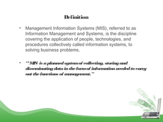 This document provides an overview of management information systems (MIS). It defines MIS as using people, technologies, and procedures to solve business problems by collecting, storing, and disseminating data needed for management functions. Some key advantages of MIS are that it allows companies to identify strengths and weaknesses, gives an overall picture of the company to aid communication and planning, and helps companies align with customer needs. MIS is characterized by a systems approach, management orientation, being need-based, exception-based, and future-oriented with integrated common data flow and long-term planning. Information generated by MIS is interrelated data that has value for decision making.