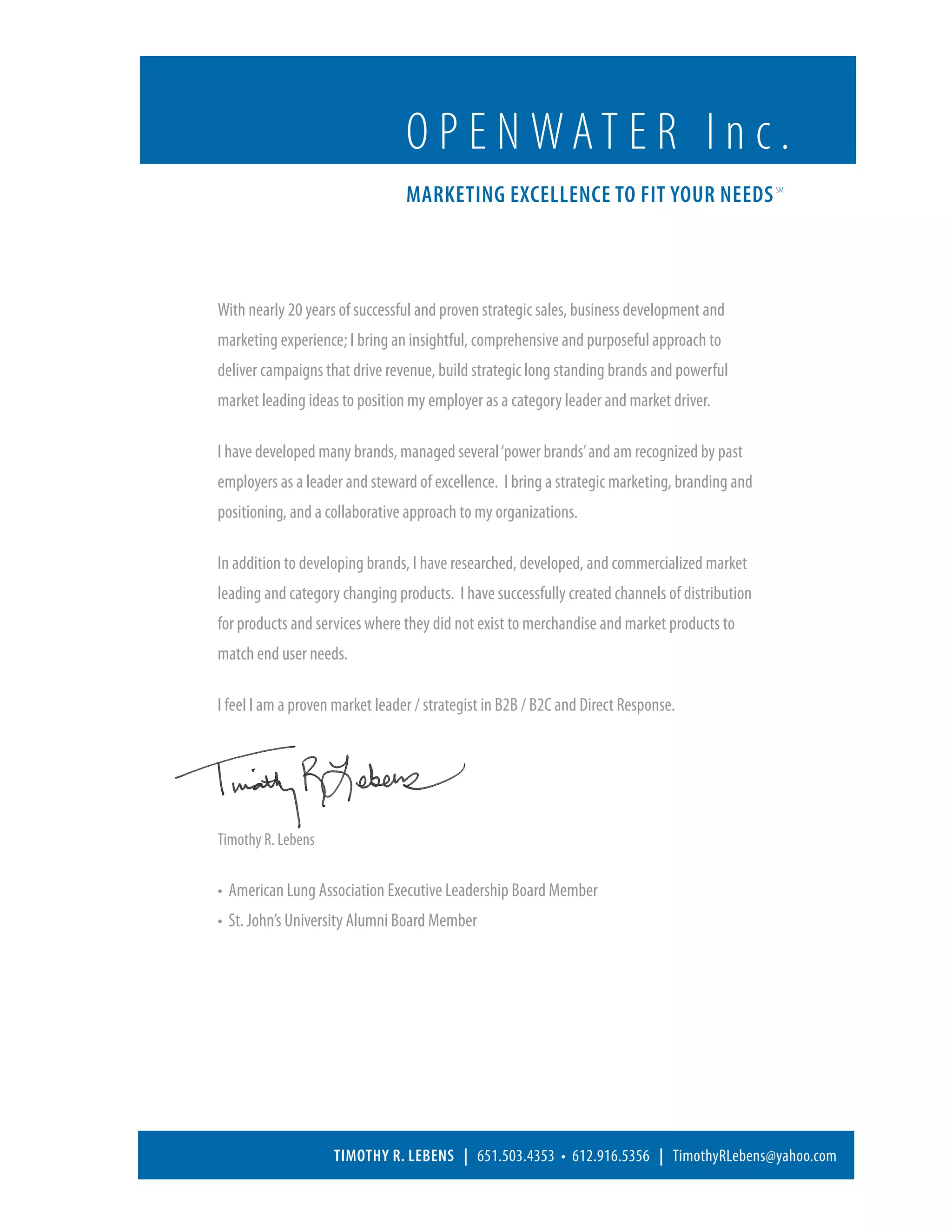 Timothy Lebens is an experienced strategic marketing and business development leader. He has nearly 20 years of experience developing brands and marketing campaigns for companies in various industries. Lebens provides strategic planning, marketing, sales, and business consulting services. He has a track record of increasing revenue, reducing costs, and helping companies launch new products and expand into new markets.