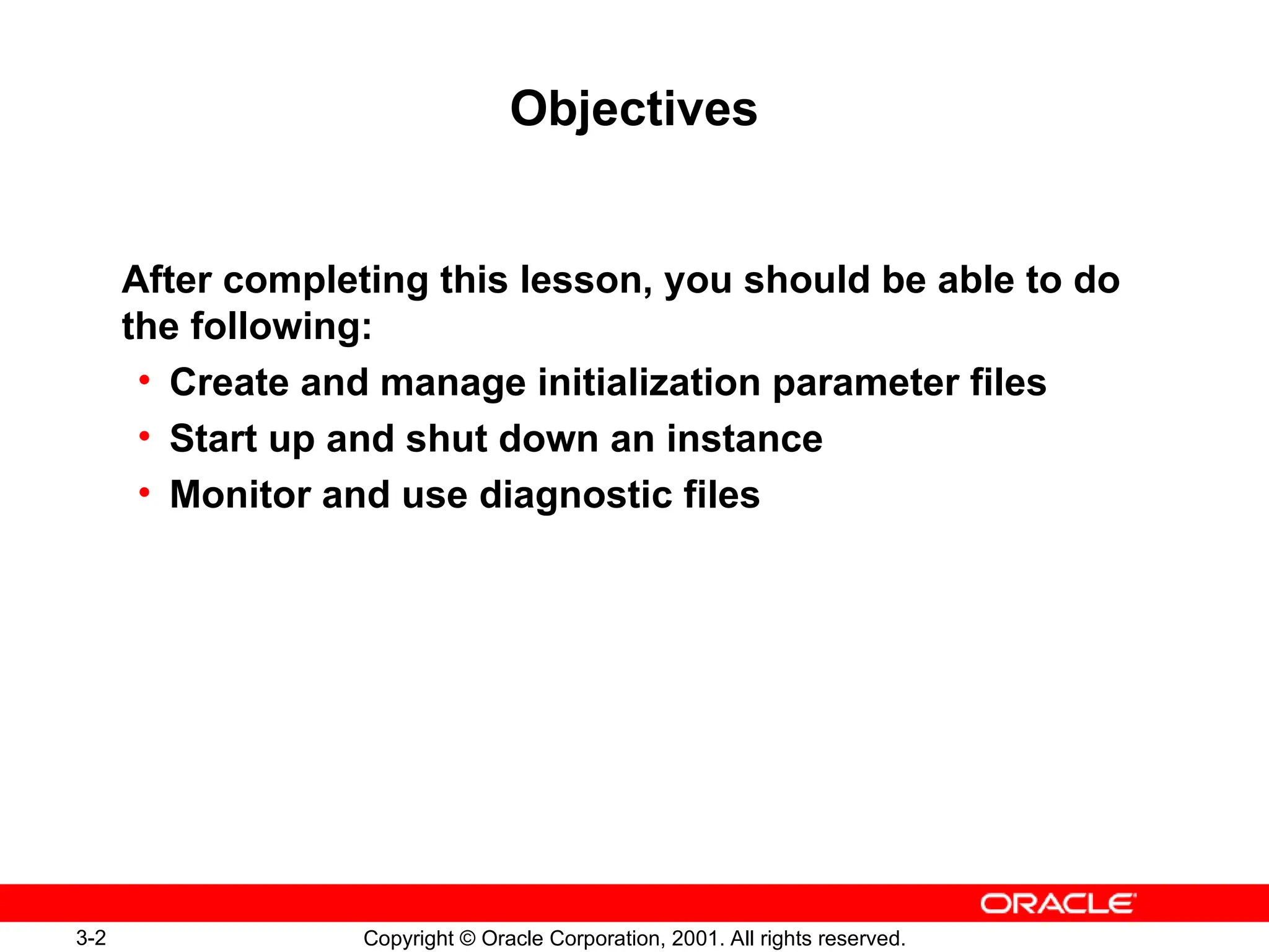 The document covers the management of Oracle instances, detailing how to create and manage initialization parameter files (pfile and spfile), start up and shut down instances, and monitor diagnostic files. It discusses the differences between static and persistent parameter files, commands for managing startup processes, and methods for tweaking database parameters. The lesson concludes with a summary of the skills learned, providing a practical approach to handling Oracle database instances.