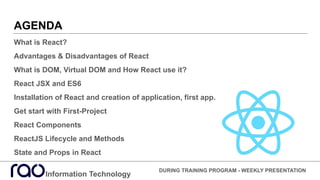 The document is a weekly presentation on React, covering its definition as an open-source JavaScript library for building user interfaces, along with its advantages and disadvantages. It also discusses key concepts such as the virtual DOM, JSX, and ES6, as well as how to install React and create applications. Furthermore, it explains React components, lifecycle methods, and the use of state and props in React applications.