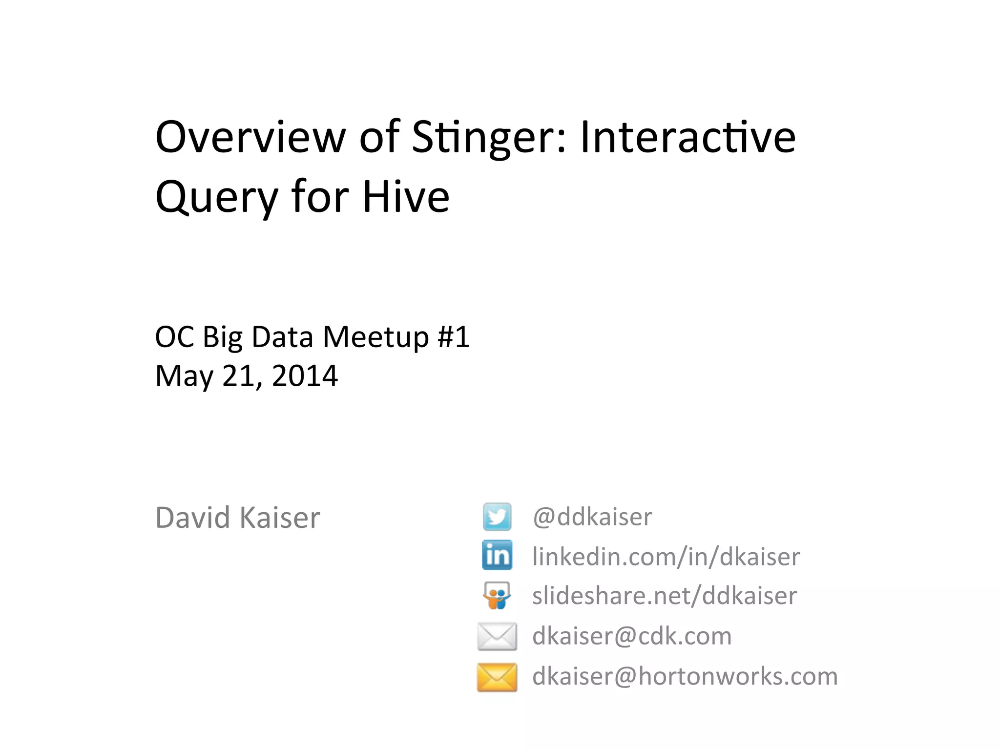 This document provides an overview of the Stinger initiative to improve the performance of Hive interactive queries. The Stinger project worked to optimize Hive so that queries return results in seconds instead of minutes or hours by implementing features like Hive on Tez, vectorized processing, predicate pushdown, the ORC file format, and a cost-based optimizer. These optimizations improved Hive performance by over 100 times, allowing interactive use of Hive for the first time on large datasets.