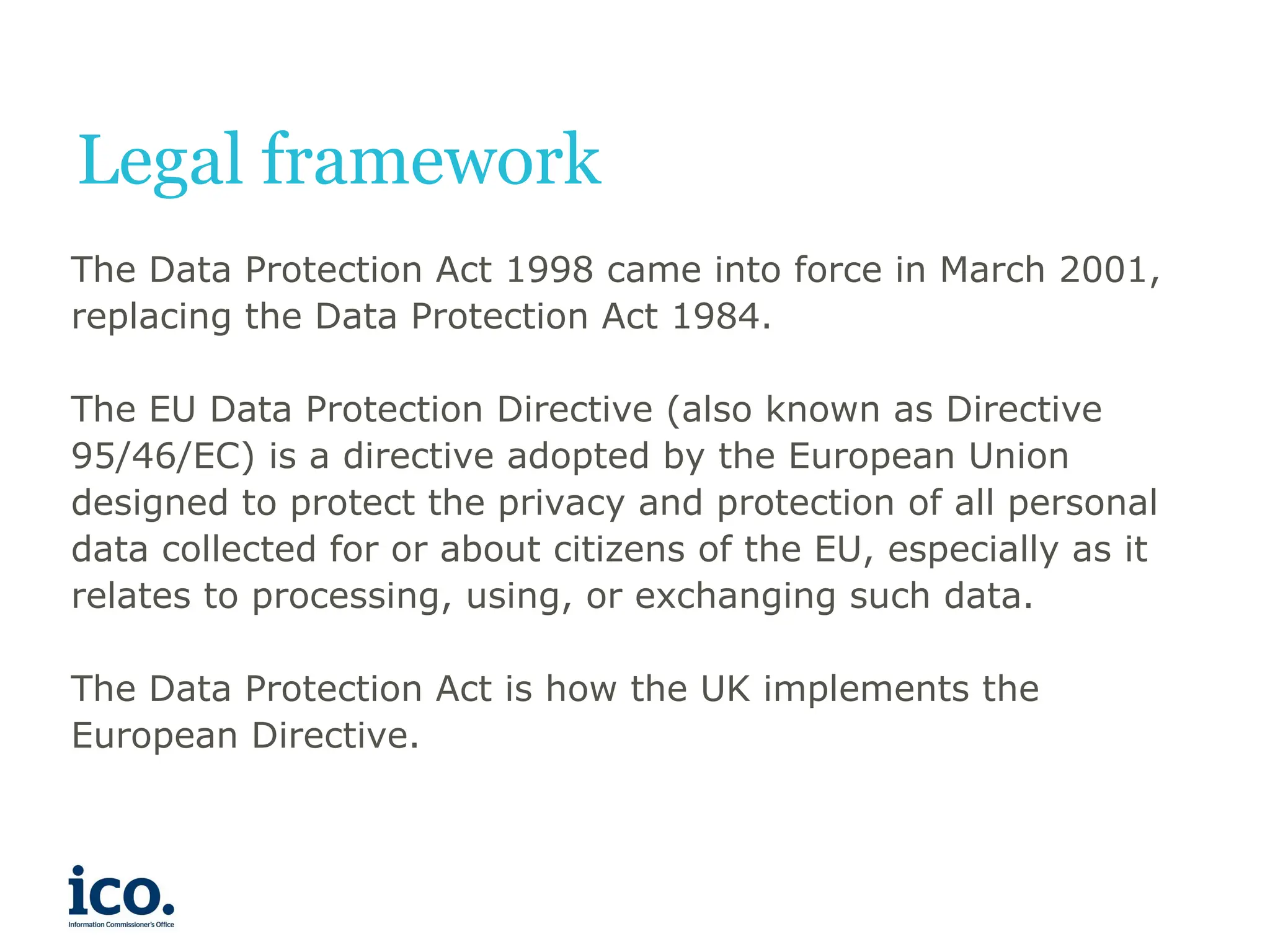 The Data Protection Act 1998, effective from March 2001, implements the EU data protection directive, providing a legal framework to protect citizens' personal data in the UK. It outlines eight principles for processing personal information and grants individuals rights such as access to their data and the ability to object to direct marketing. The Information Commissioner's Office (ICO) is responsible for overseeing compliance, handling complaints, and has the power to impose monetary penalties for serious breaches.