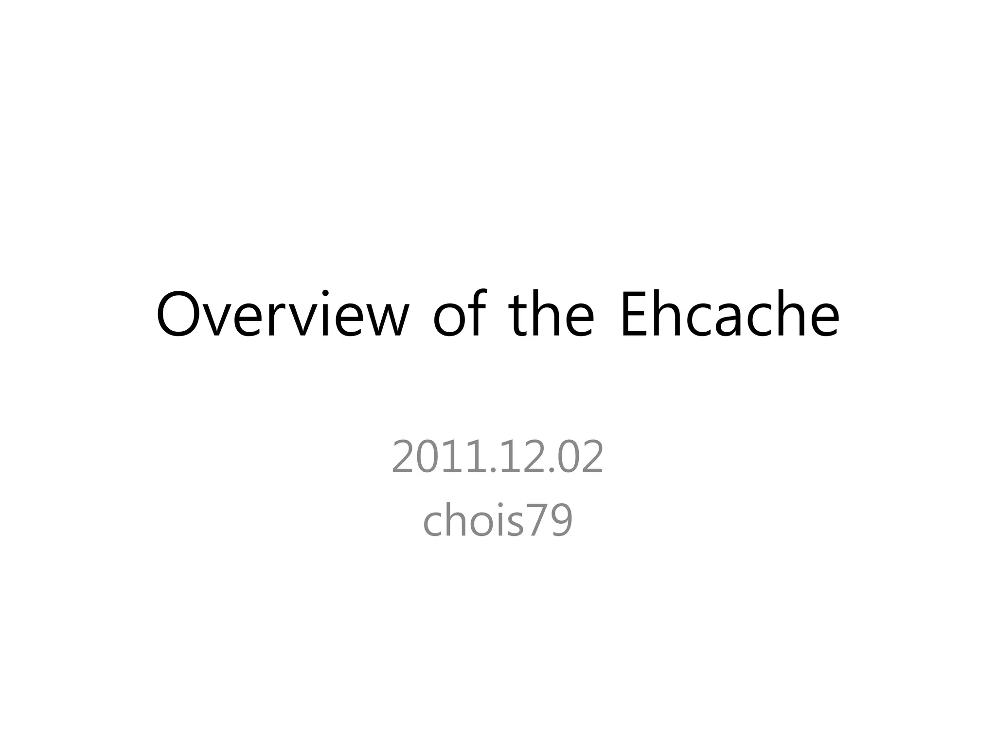 Ehcache is an open source Java caching library that provides fast, scalable caching for applications. It allows for in-process caching with single nodes or distributed caching across multiple nodes. Ehcache provides features like memory and disk storage, replication, search capabilities, and integration with Terracotta for distributed caching. It uses common caching patterns like cache-aside, read-through, write-through, and cache-as-sor. Ehcache has a simple API and is lightweight, scalable, and standards-based.