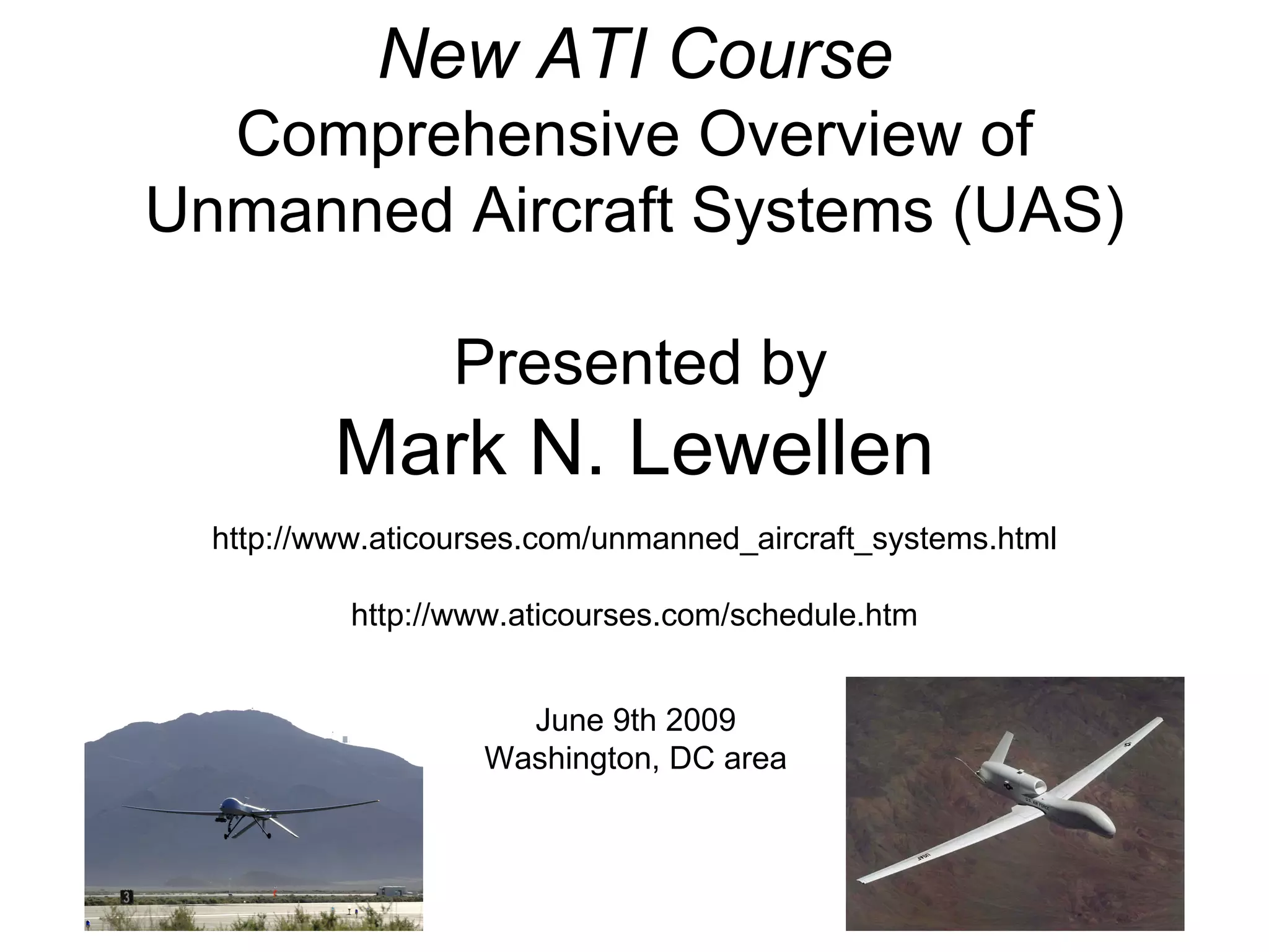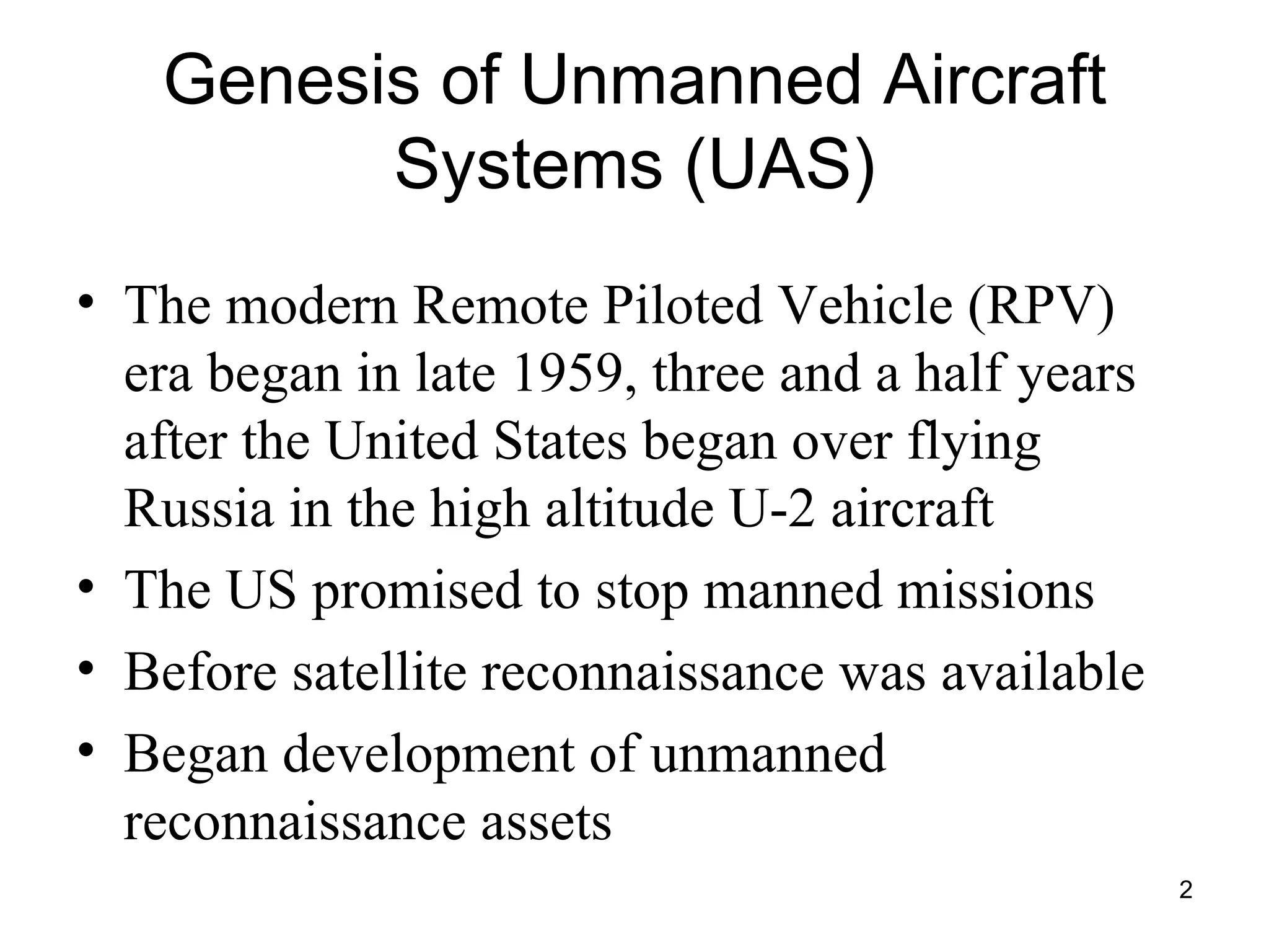 The document provides an overview of unmanned aircraft systems (UAS), including their history and evolution from remote piloted vehicles (RPV) to unmanned aerial vehicles (UAV) to today's unmanned aircraft systems (UAS). It describes various UAS including the Raven, Shadow, Predator, and Global Hawk and discusses their missions, features, and technical specifications. It also discusses spectrum needs and challenges for integrating UAS into national airspace, including the need for protected aeronautical frequency allocations to ensure their safe operation.