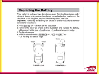 1) Functions such as BIMDAS, memory, prime factors, conversions between decimal, fraction and recurring decimal forms, and statistical and regression calculations.