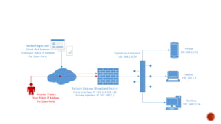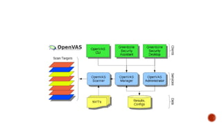 The document discusses vulnerability scanning and OpenVAS. Vulnerability scanning involves using a scanner to identify security weaknesses. OpenVAS is an open source vulnerability scanning framework that consists of several services and tools for vulnerability scanning and management. At the center is the OpenVAS scanner which executes Network Vulnerability Tests (NVTs) from an NVT database that is regularly updated. The OpenVAS Manager receives tasks from the administrator and keeps a history of past scans.