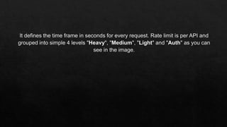 The API allows 10 heavy, 40 medium, 50 light requests per user and 5 authorization requests; exceeding these thresholds will result in a 429 Too Many Requests HTTP error code. The document discusses that when requests begin exceeding limitations, servers commonly return responses with a 429 status.