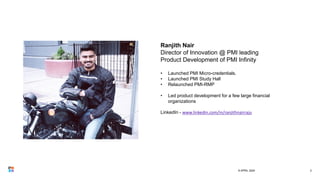 PMI Infinity, led by Ranjith Nair, is an advanced AI tool aimed at improving project management success and efficiency. The tool acts as a copilot for project professionals by providing reliable solutions and insights from a vast content library, addressing challenges like budget overruns and scheduling conflicts. Current research indicates a significant impact of AI technologies on project management, with the adoption of generative AI being a top priority for organizations in 2024.