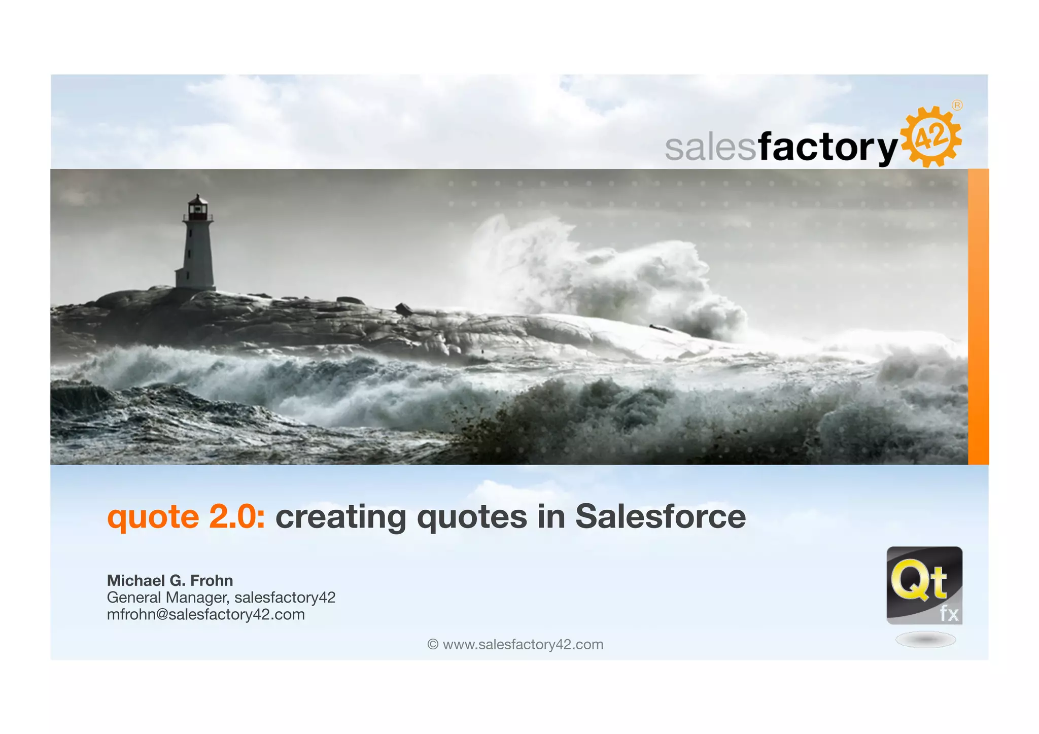 Quote 2.0 is a Salesforce app that allows users to easily create quotes within Salesforce. It provides benefits such as fast quote generation, improved visibility into quotes and forecasts, and increased customer satisfaction. Quote 2.0 integrates natively with Salesforce and offers an intuitive interface for creating, managing, and approving quotes. It also supports features like multi-tier channel partners, alternative line items, and workflows.
