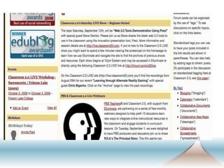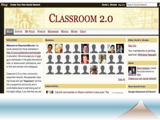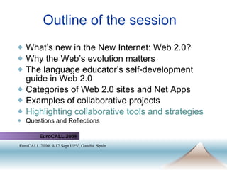 The document provides an overview of Web 2.0 tools for collaborative language learning presented at the Eurocall 2009 conference. It highlights the evolution of the internet, the implications of Web 2.0 for education, and the significance of collaborative tools for enhancing learning experiences. Key categories of Web 2.0 tools are outlined, including virtual environments, social networks, collaborative tools, communication tools, and media sharing resources.