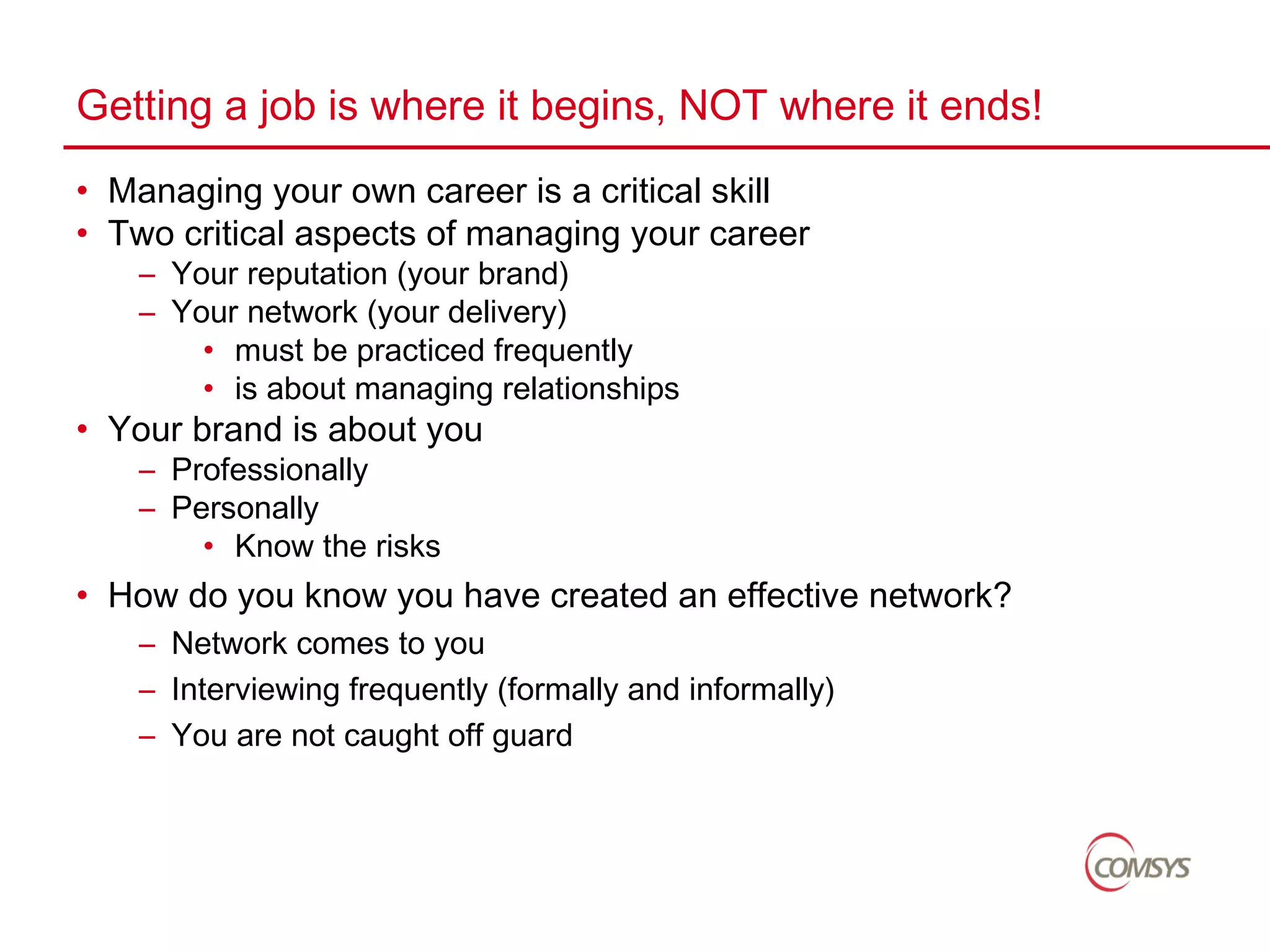 1) Managing your career involves maintaining your reputation ("brand") and network ("delivery") through relationships built over time.