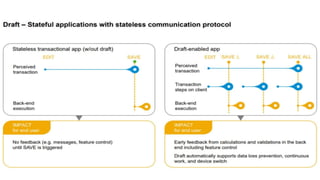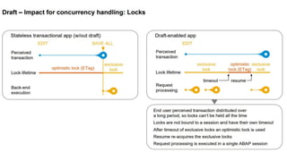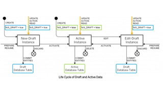 The document provides an overview of Behavior Definition and its components within the RAP (Rapid Application Programming) framework, detailing the behavior characteristics and body associated with business objects (BO). It covers standard operations like CRUD, Entity Manipulation Language (EML) functionalities, validation, and determination processes, alongside concurrency control and draft handling mechanisms. Additionally, it describes the implementation details, syntax, and practical usage of actions, projections, and the RAP generator for deploying applications.